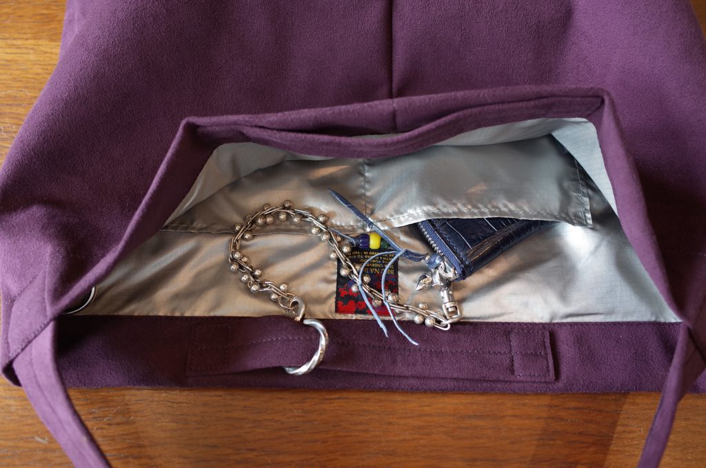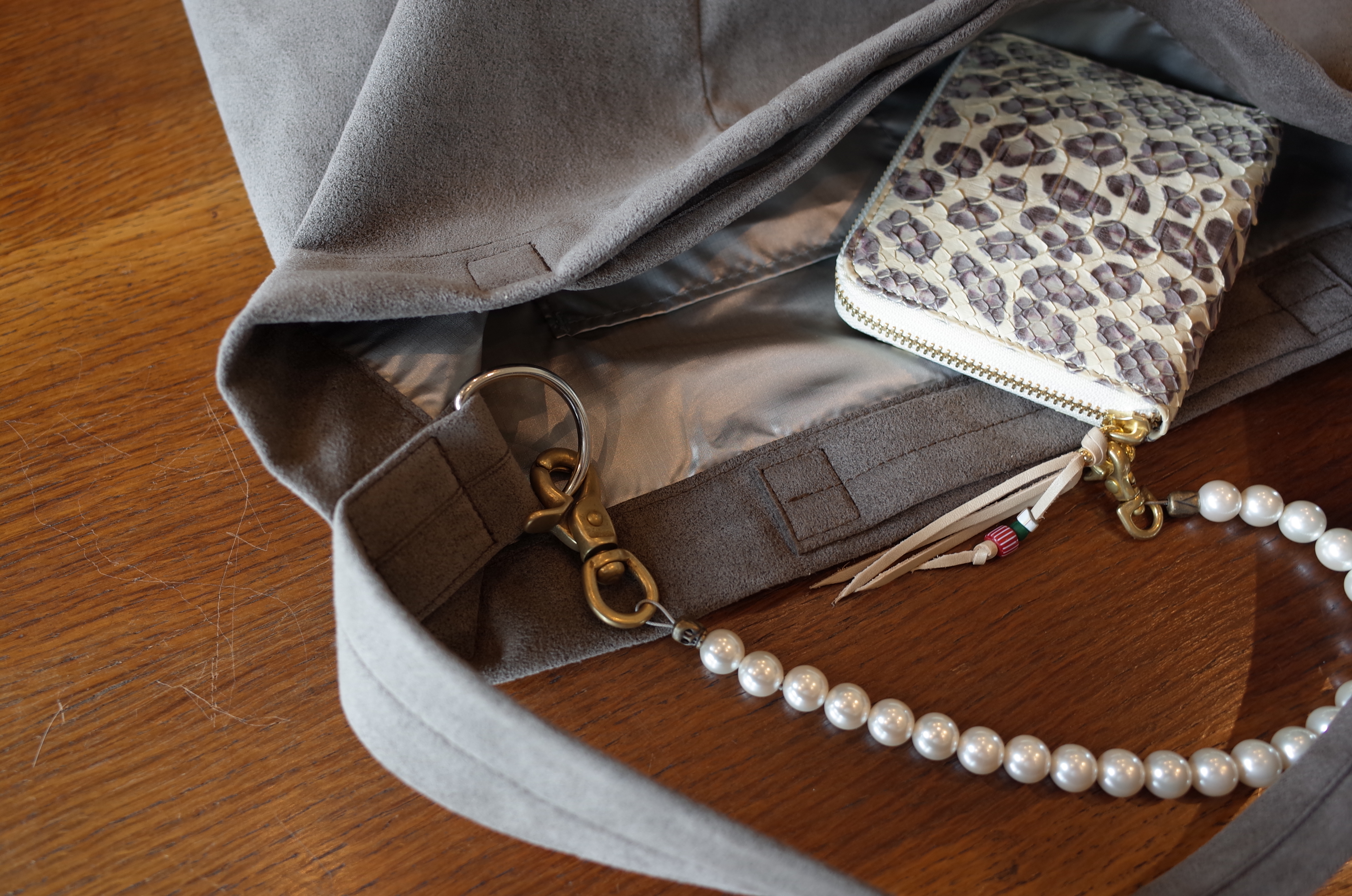 フェイク・スェードの3ウェイ(ショルダー、手提げ、折りたたんでクラッチ)バッグと、