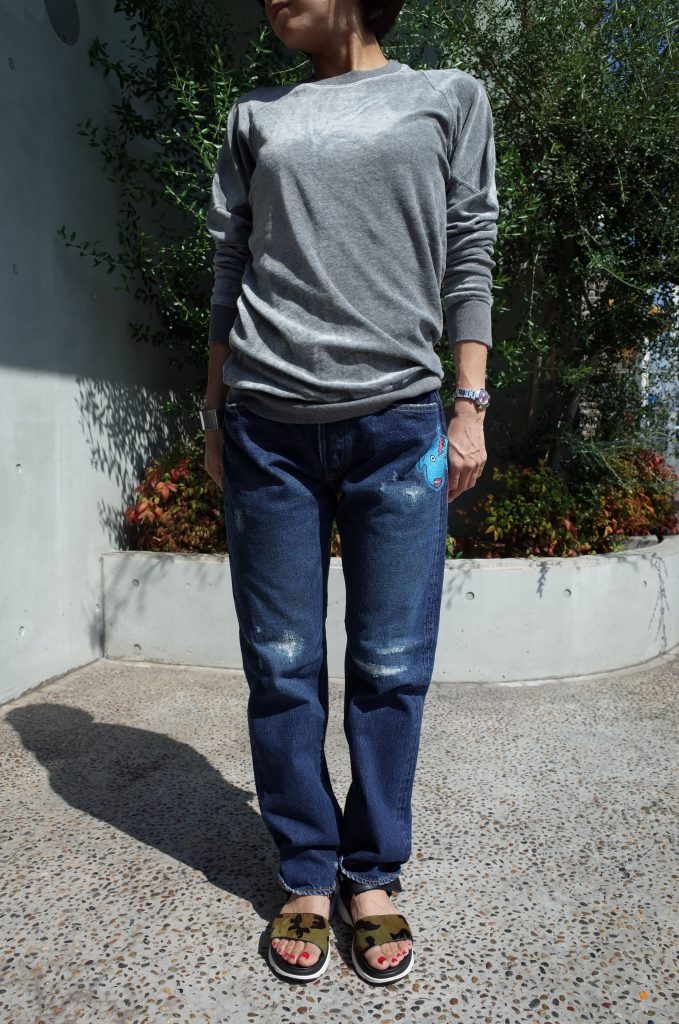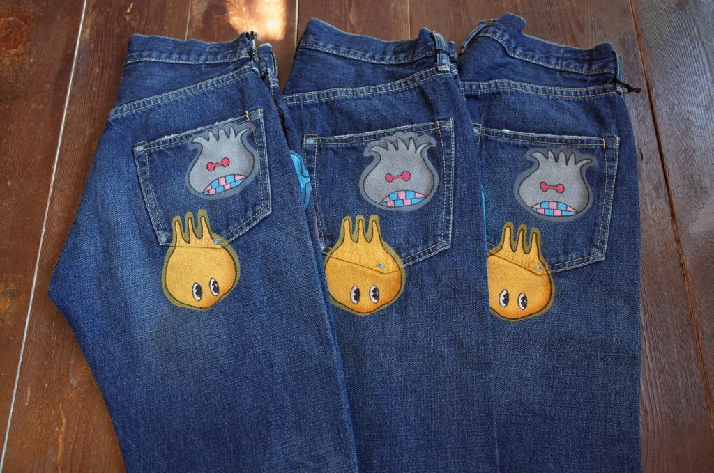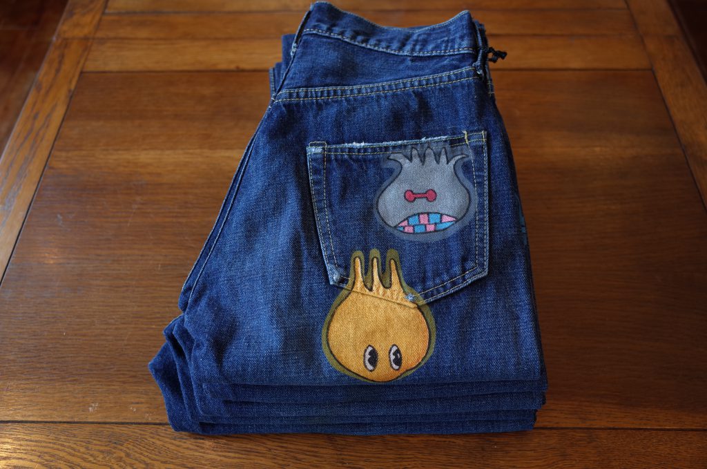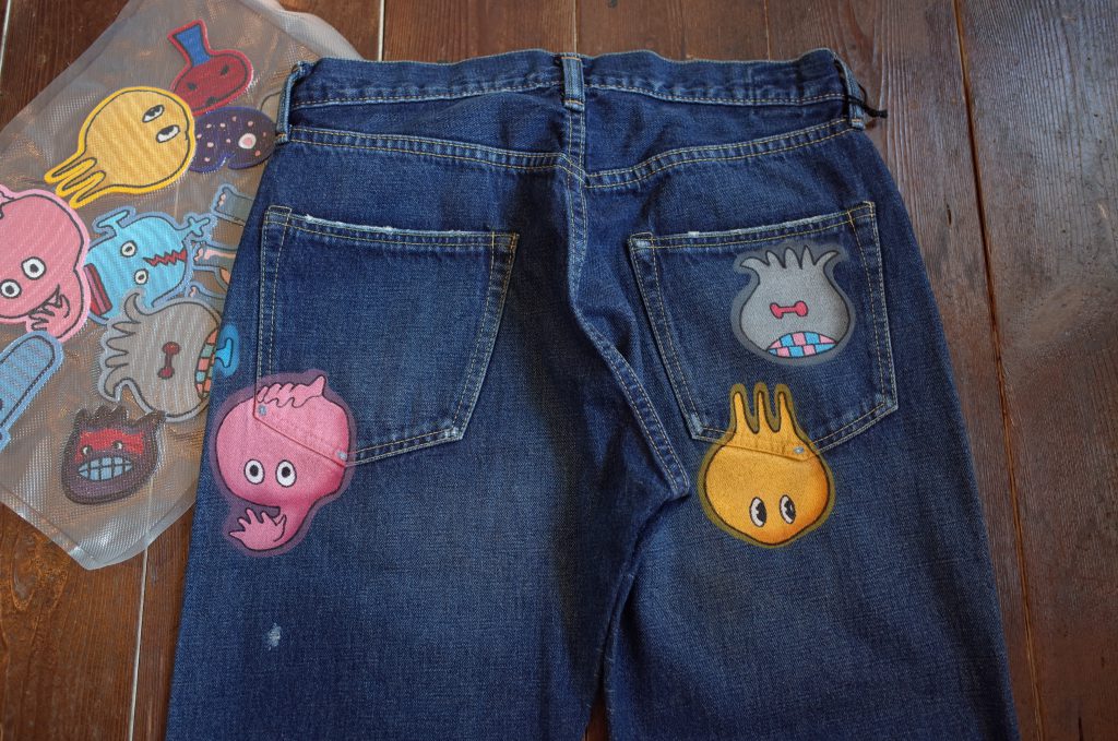 ベースのデニムの生地もそうですが、加工の仕方が抜群に上手いので、ここまで不思議なキャラクターが描かれてても、子供っぽくならないのは流石やと思います。