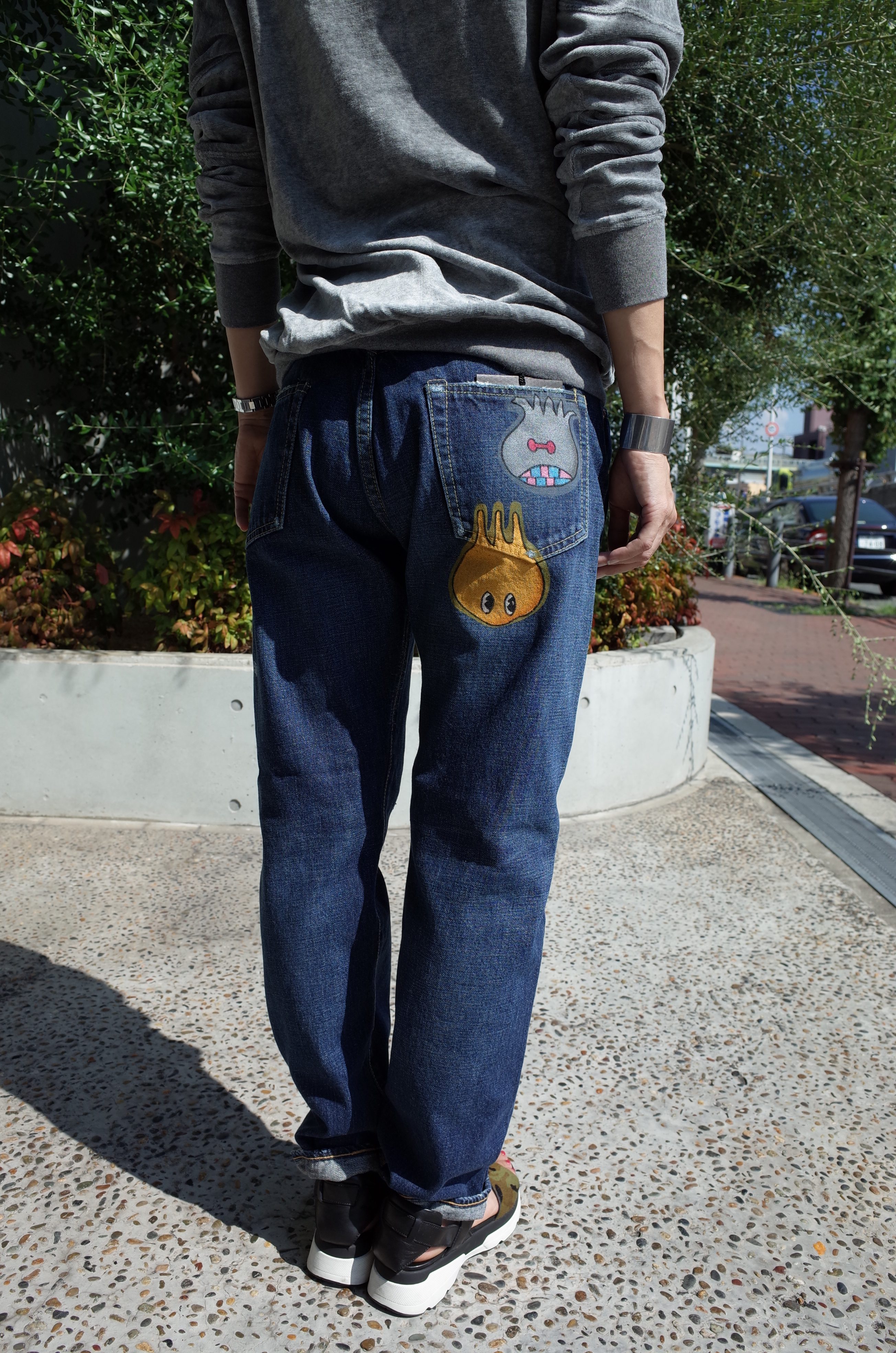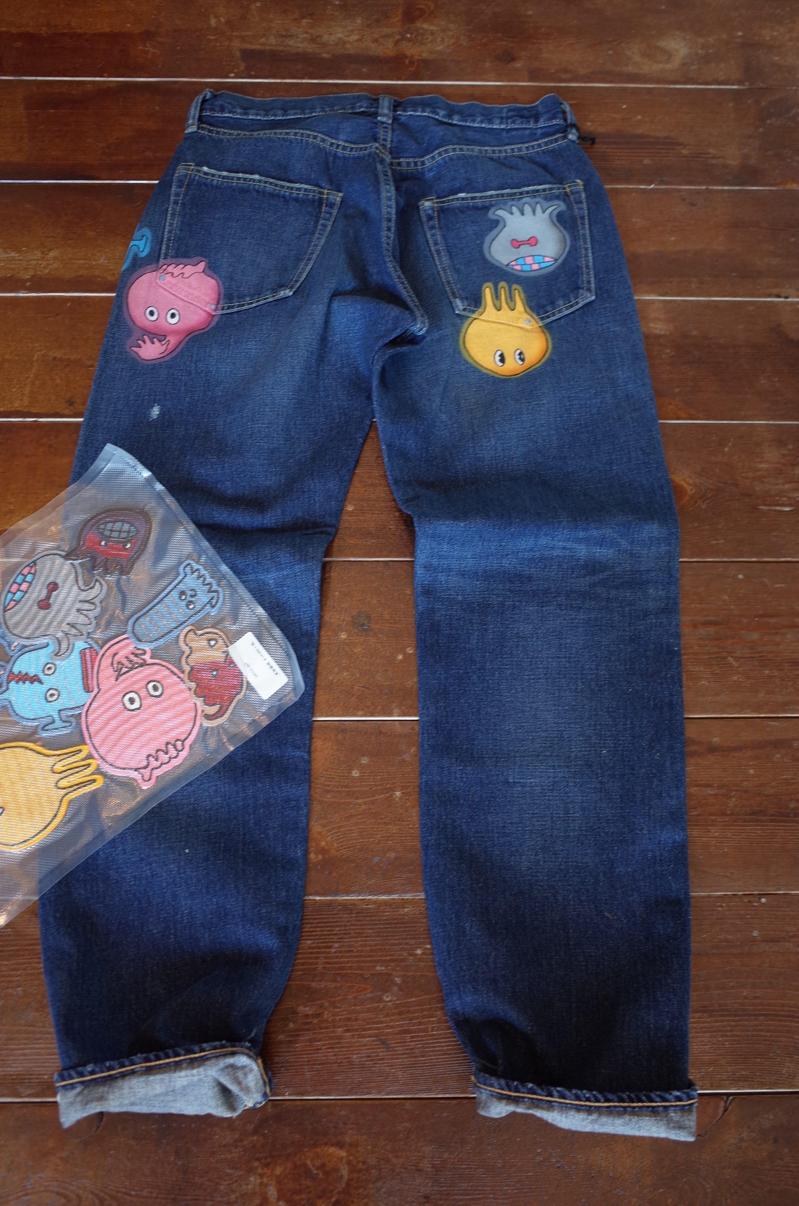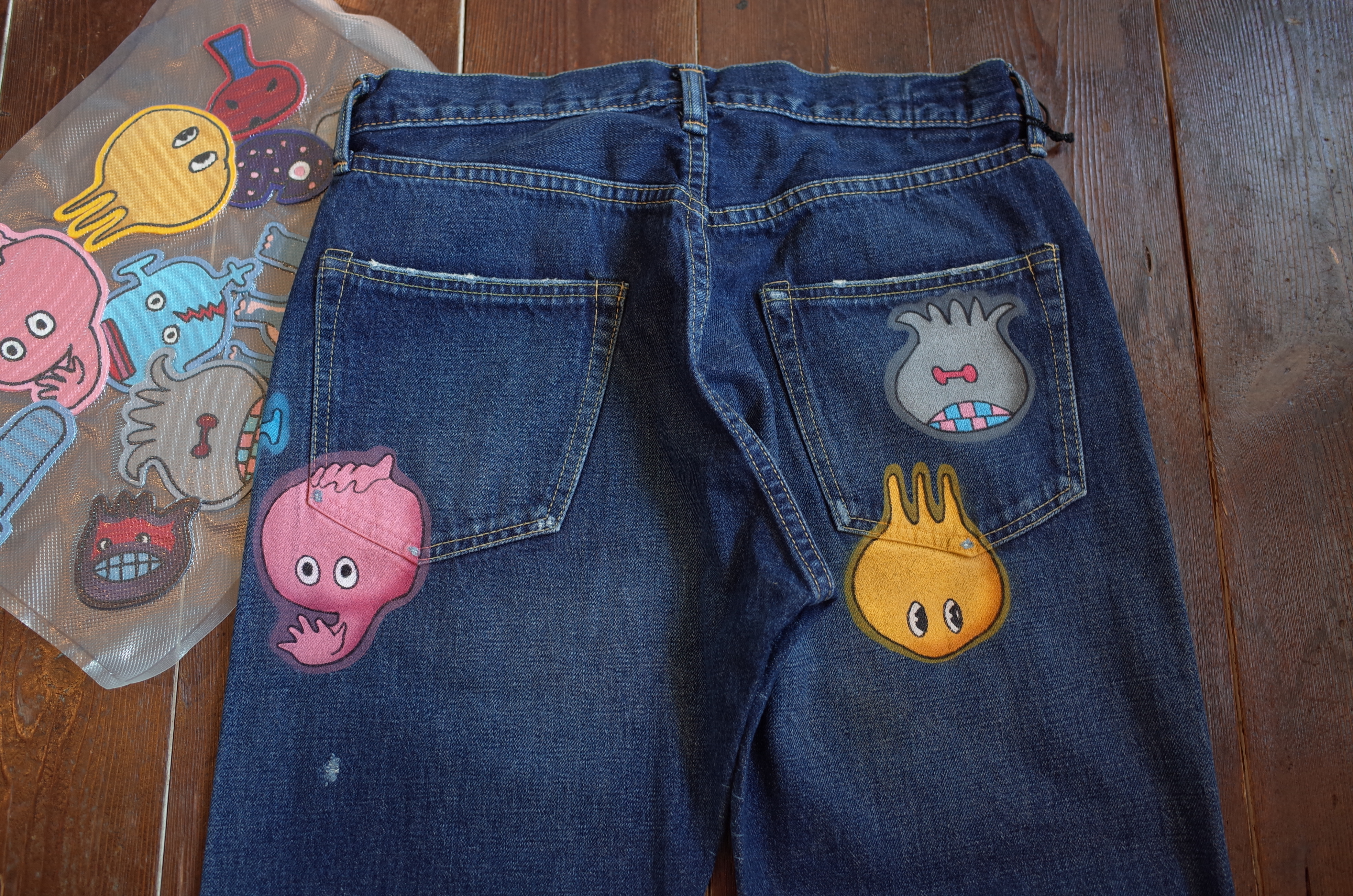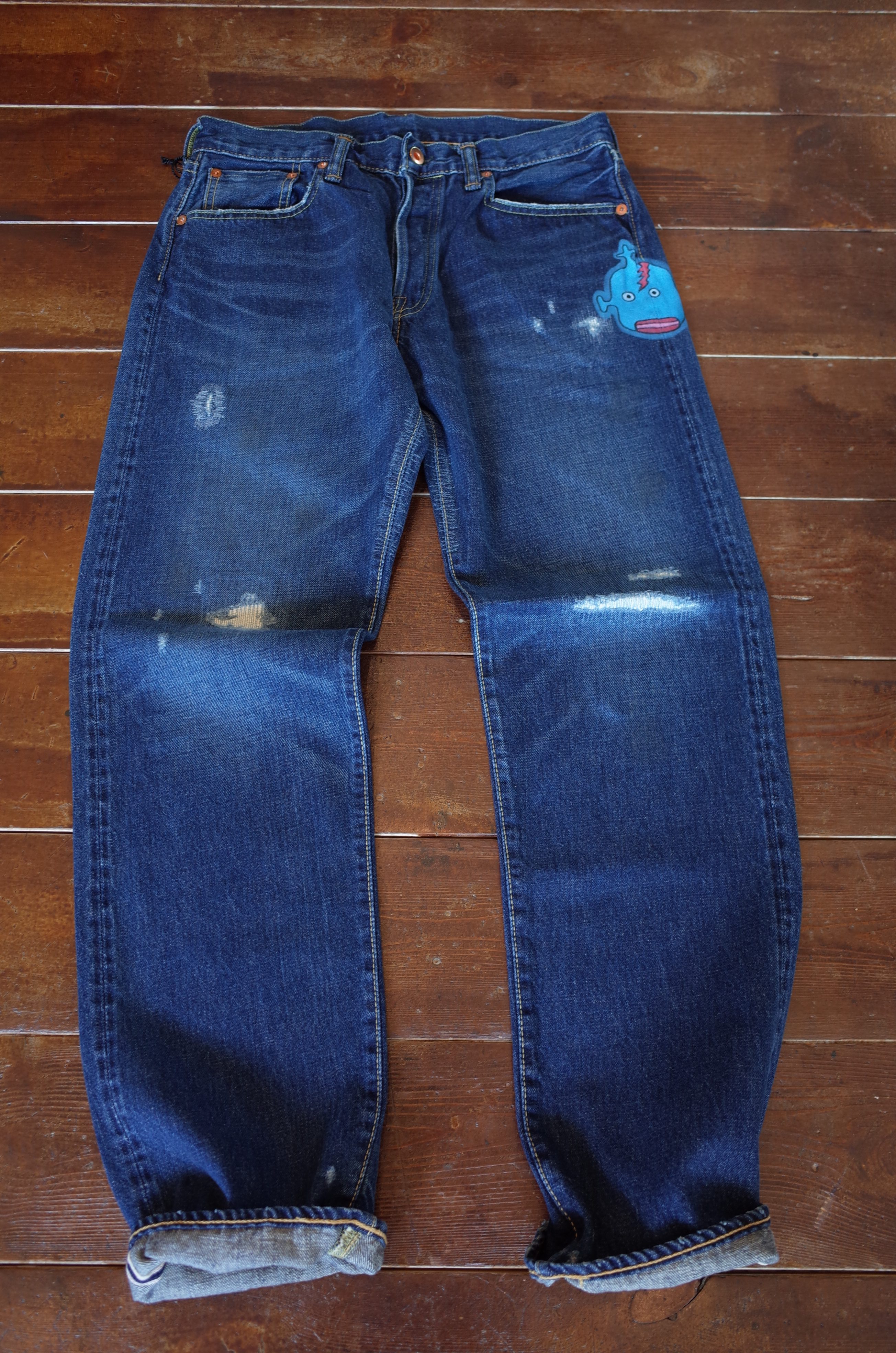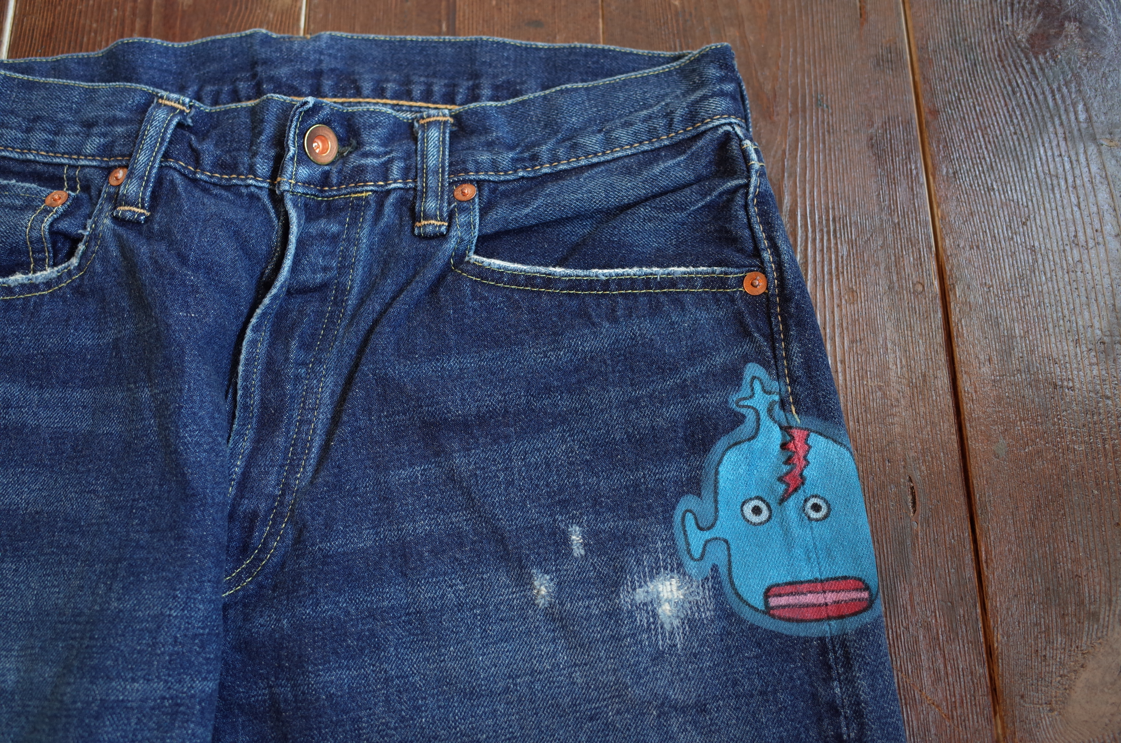 中古の#501なんかにたまに見る、元のアメリカ人所有者がワッペン貼ったりペイントしたりしたカスタムデニムのイメージですね、