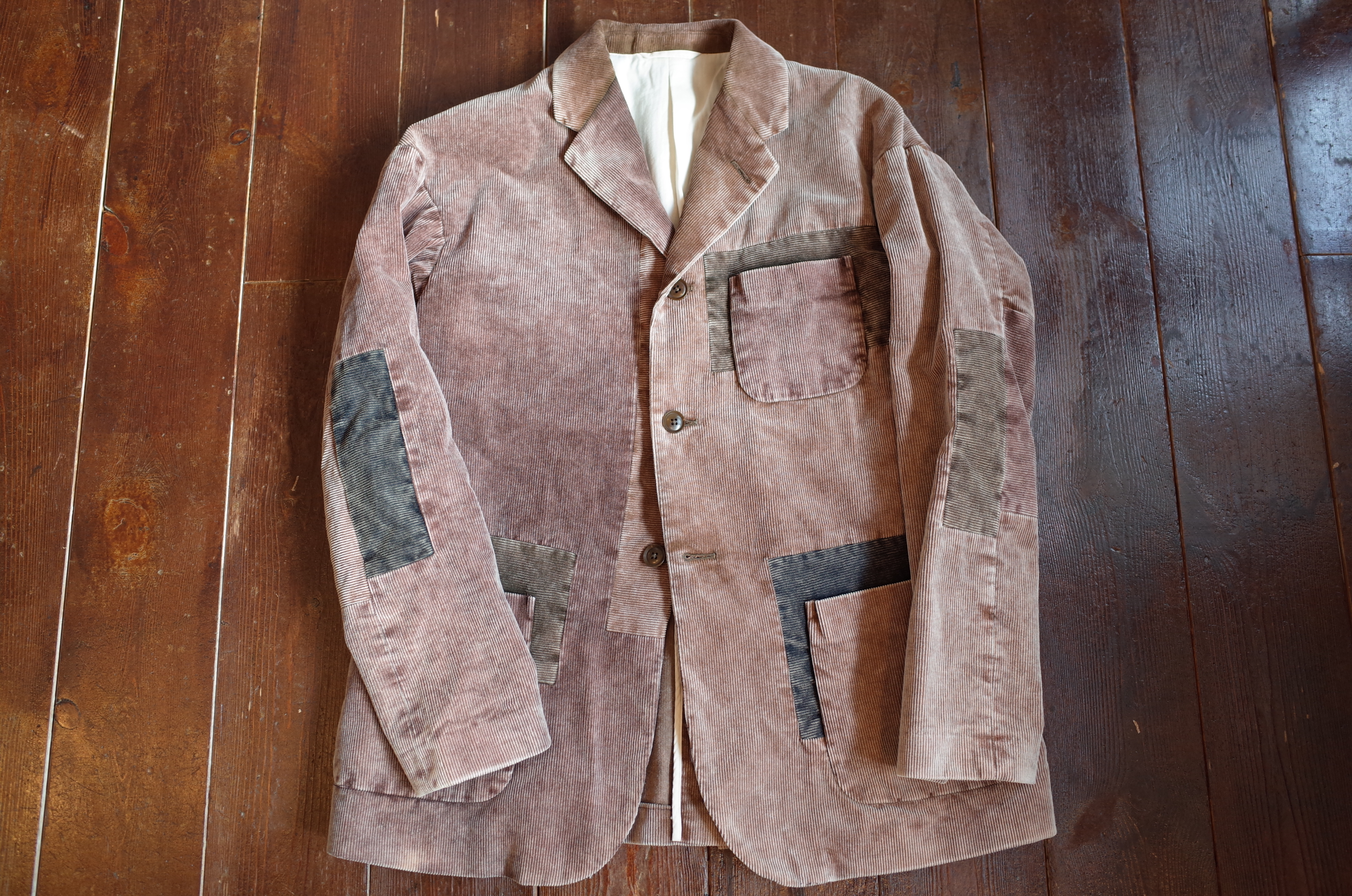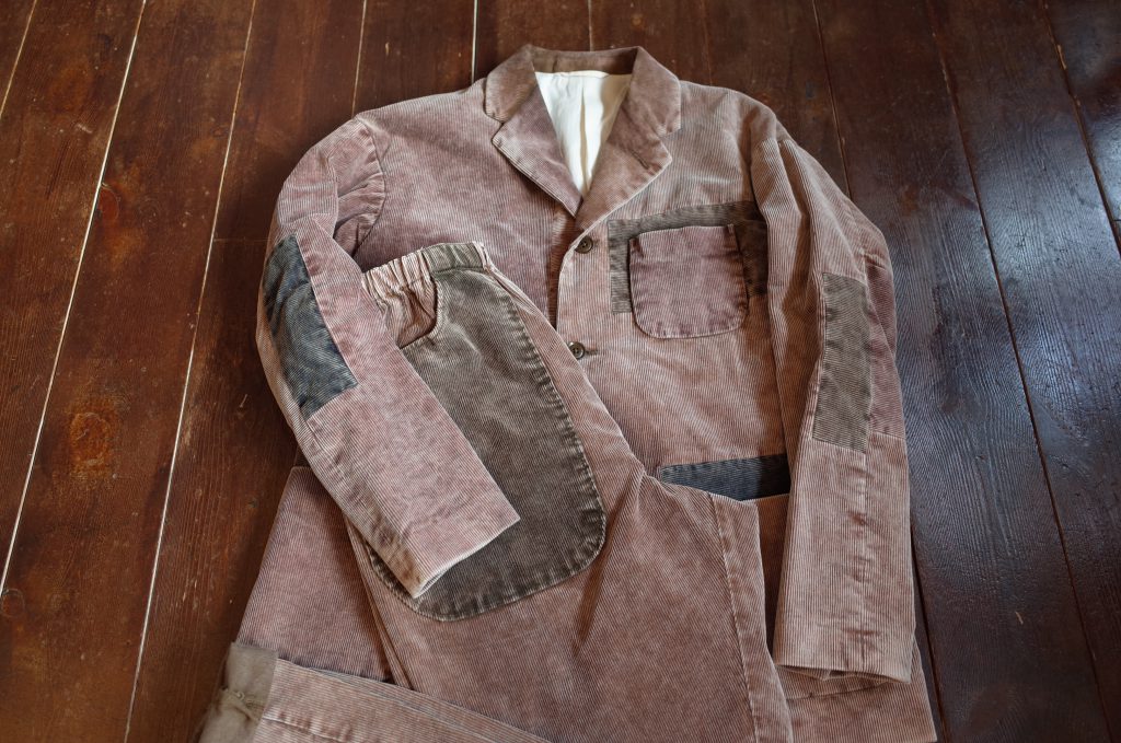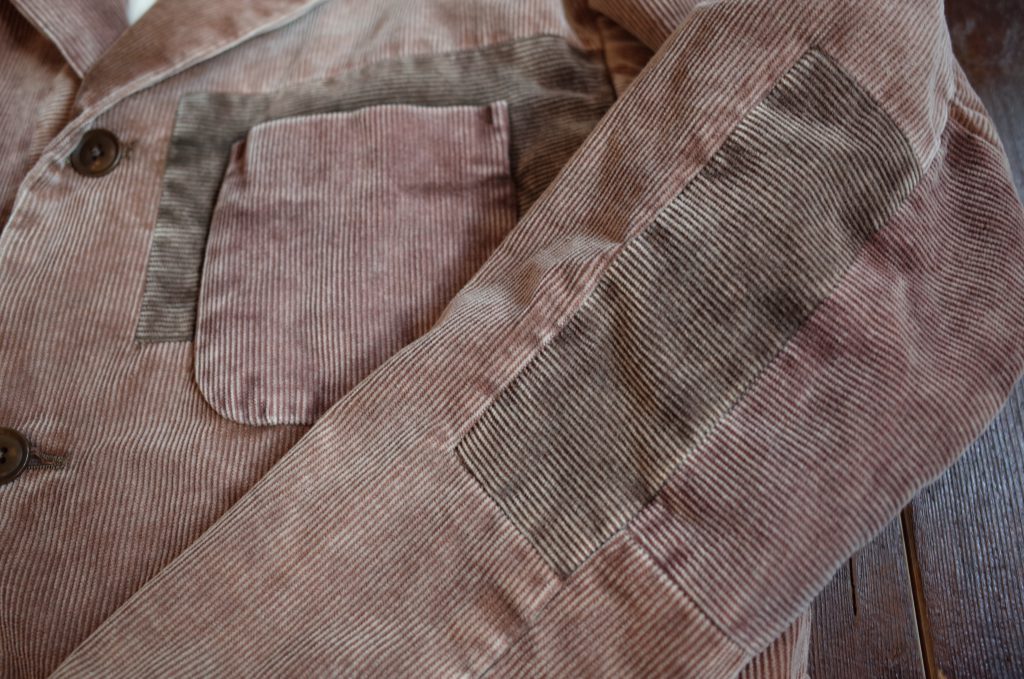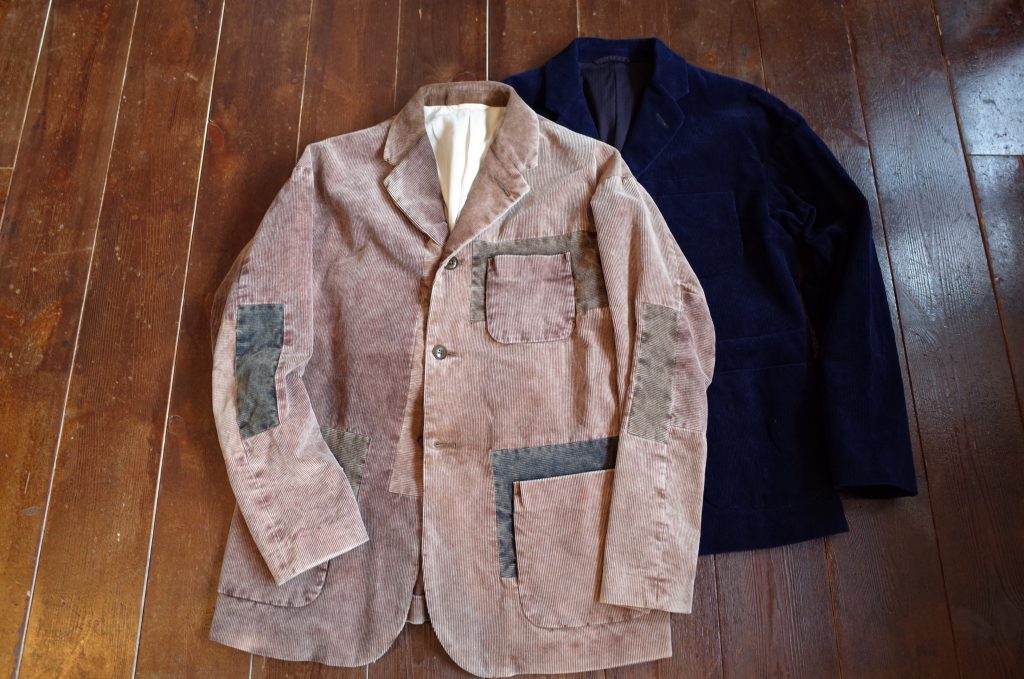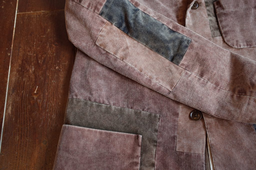 コール天のジャケットに色の違う生地を、向きを変えながらもランダムに、また綺麗にはめ込み、