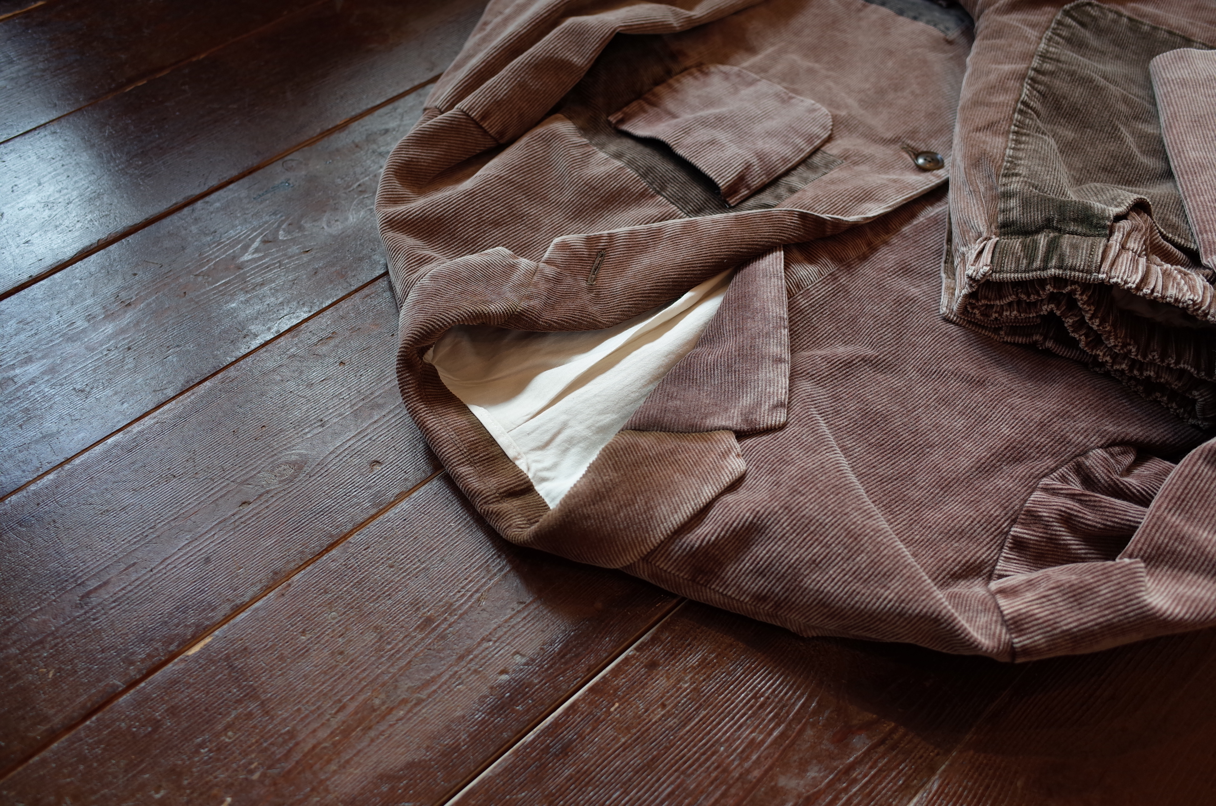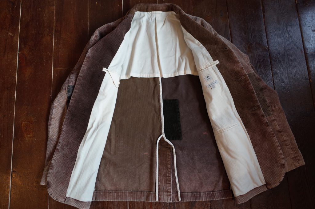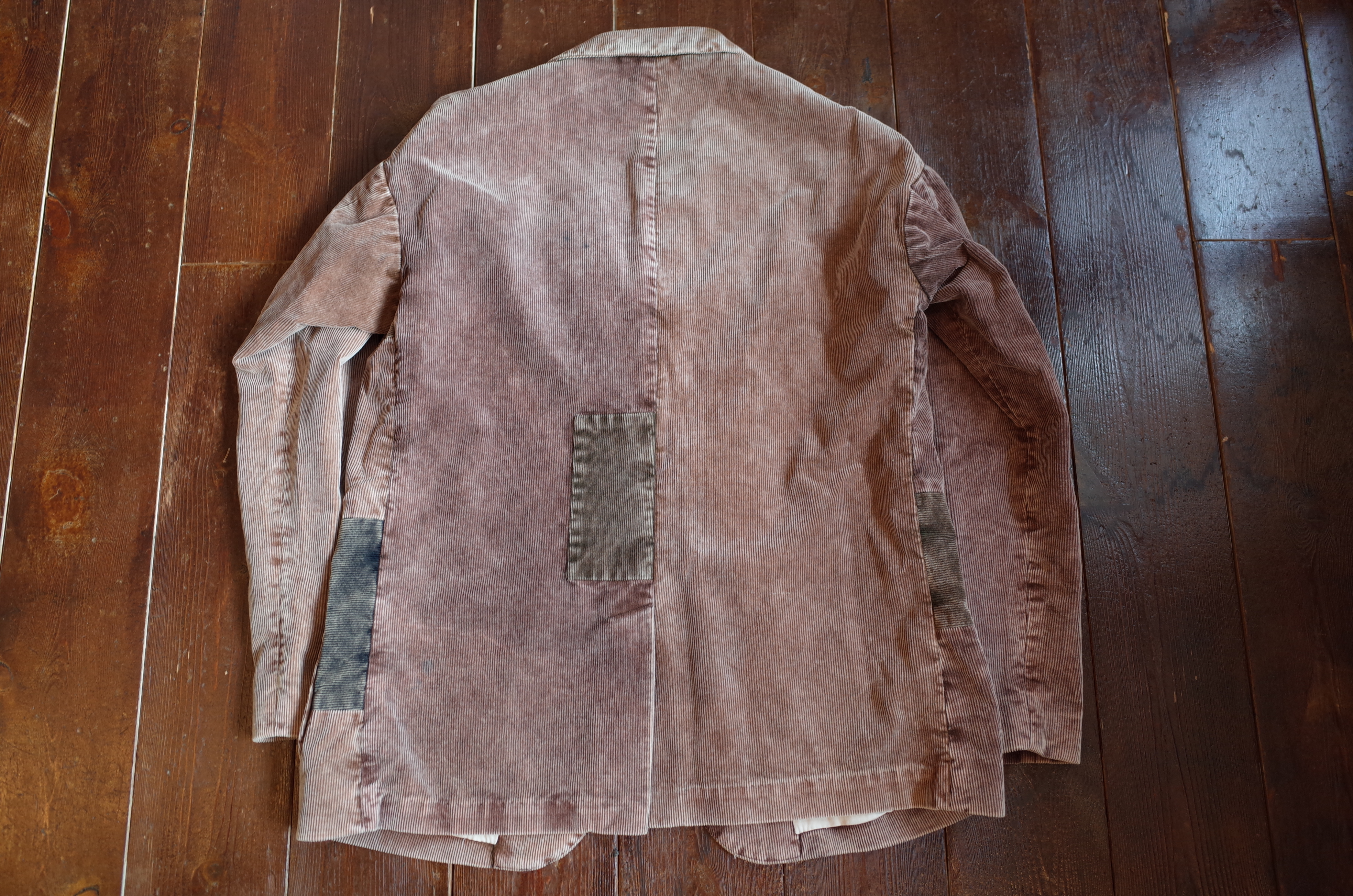 コール天のジャケットに色の違う生地を、向きを変えながらもランダムに、また綺麗にはめ込み、