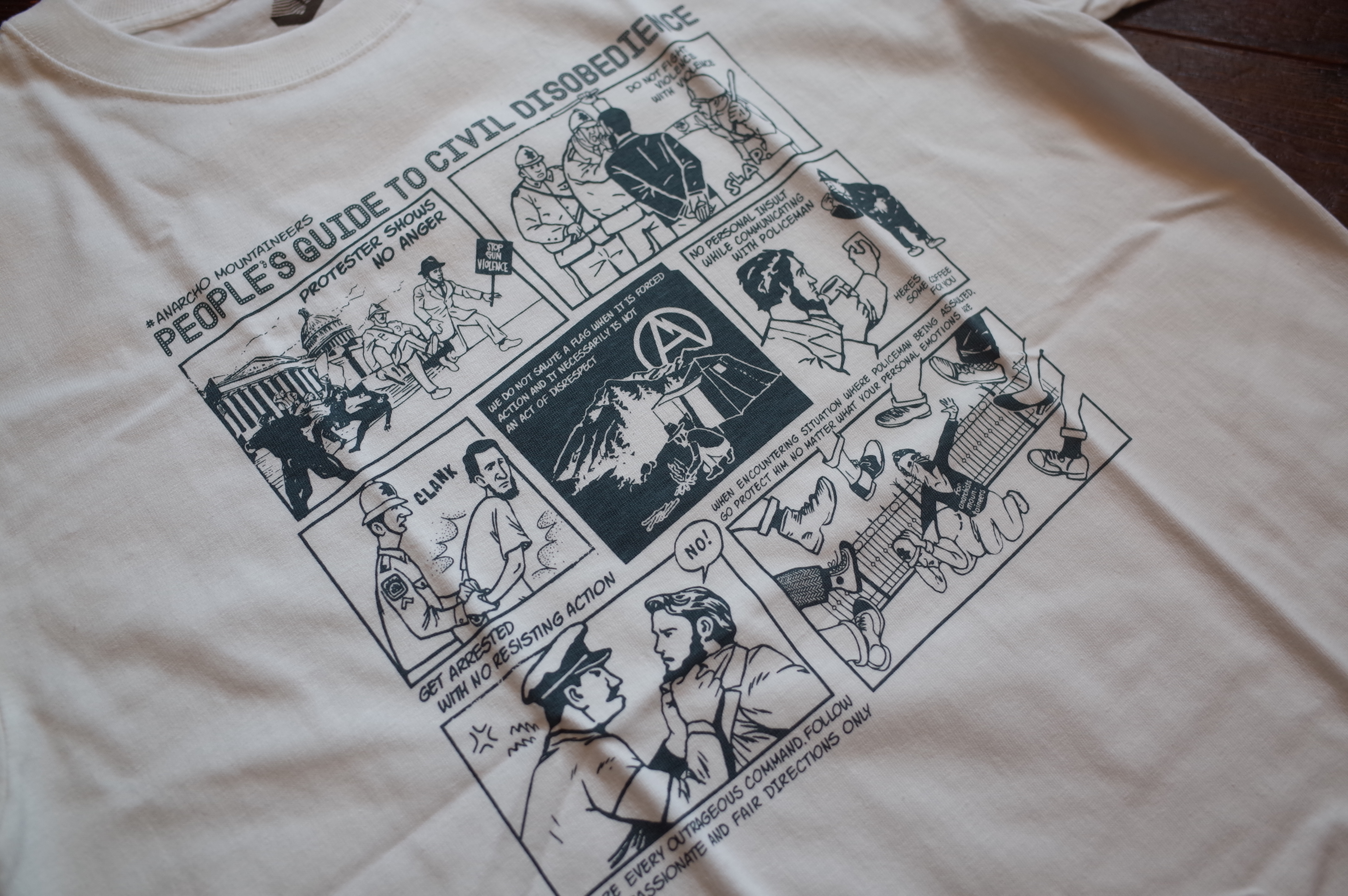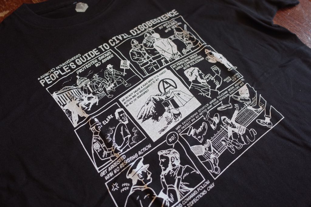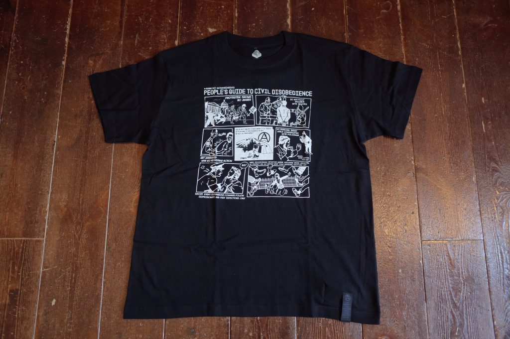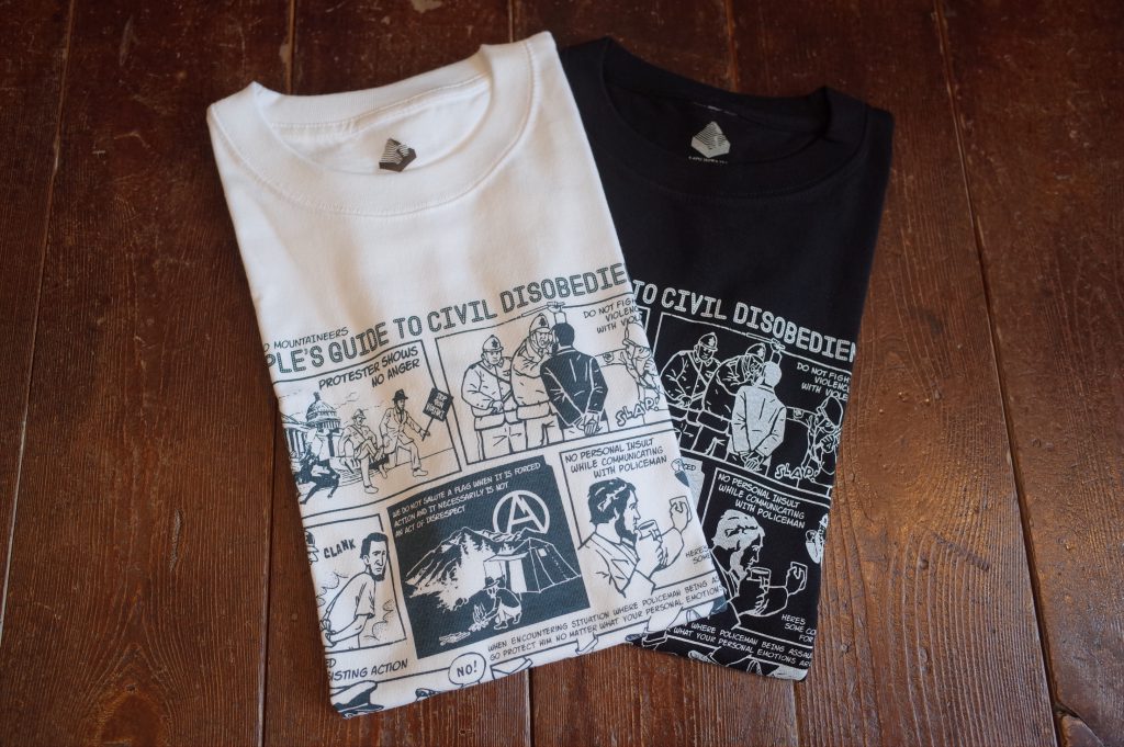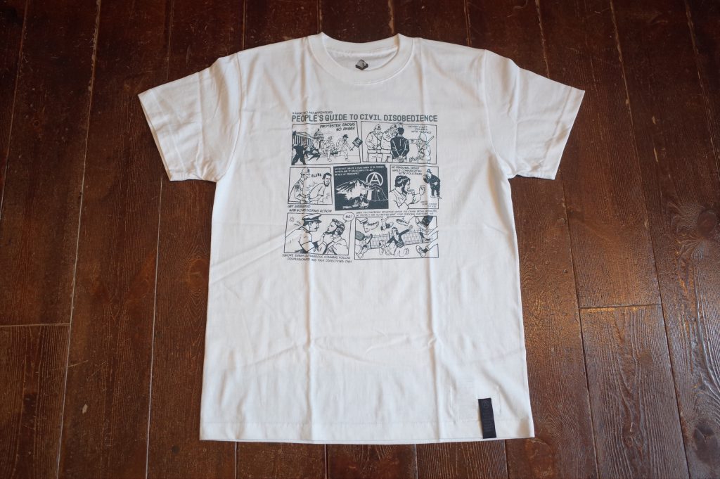PROTESTER’s cotton short sleeve TEE with Jerry Ukai’s Person’s Guide to Civil Disobedience cartoon print.