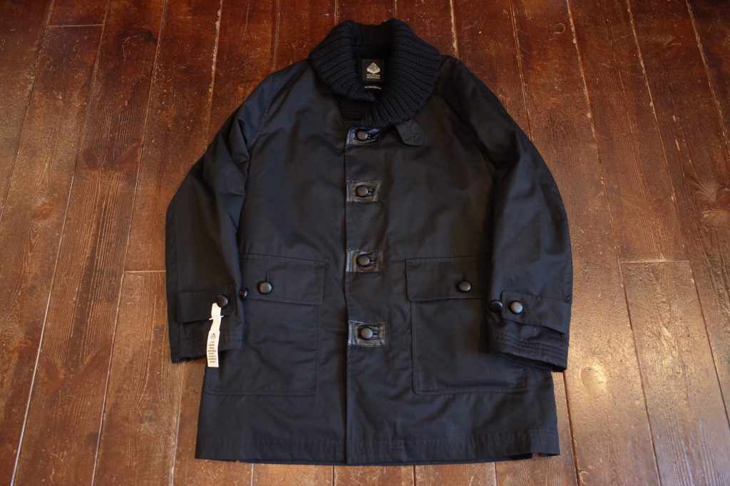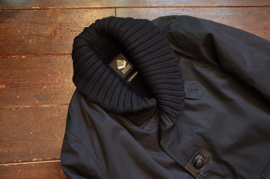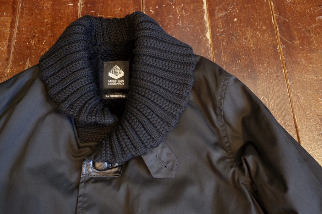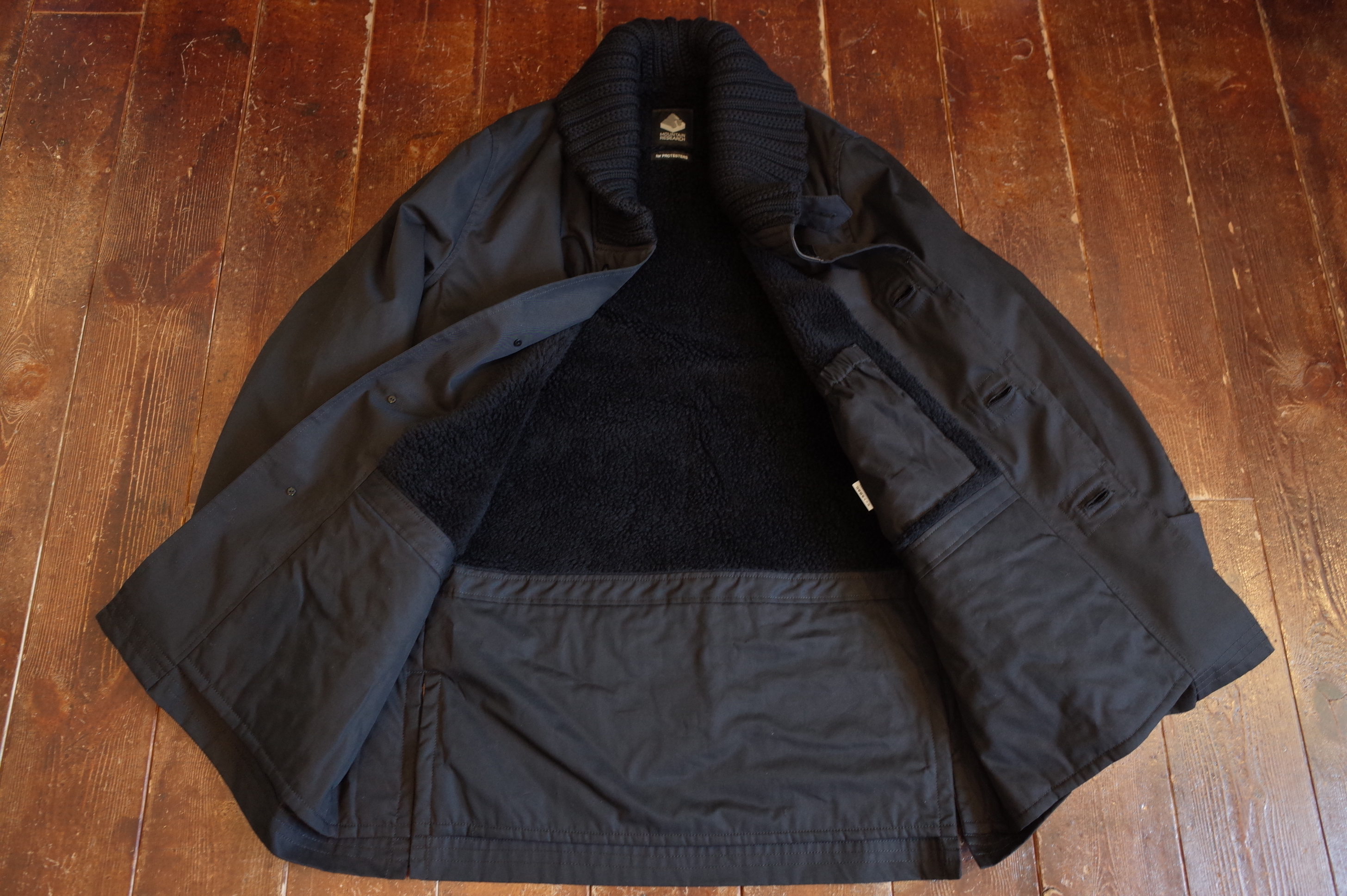 PROTESTER’s black cotton gaberdine donkey jacket with leather walnut buttons, boa lining, knit collar