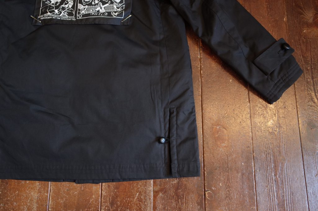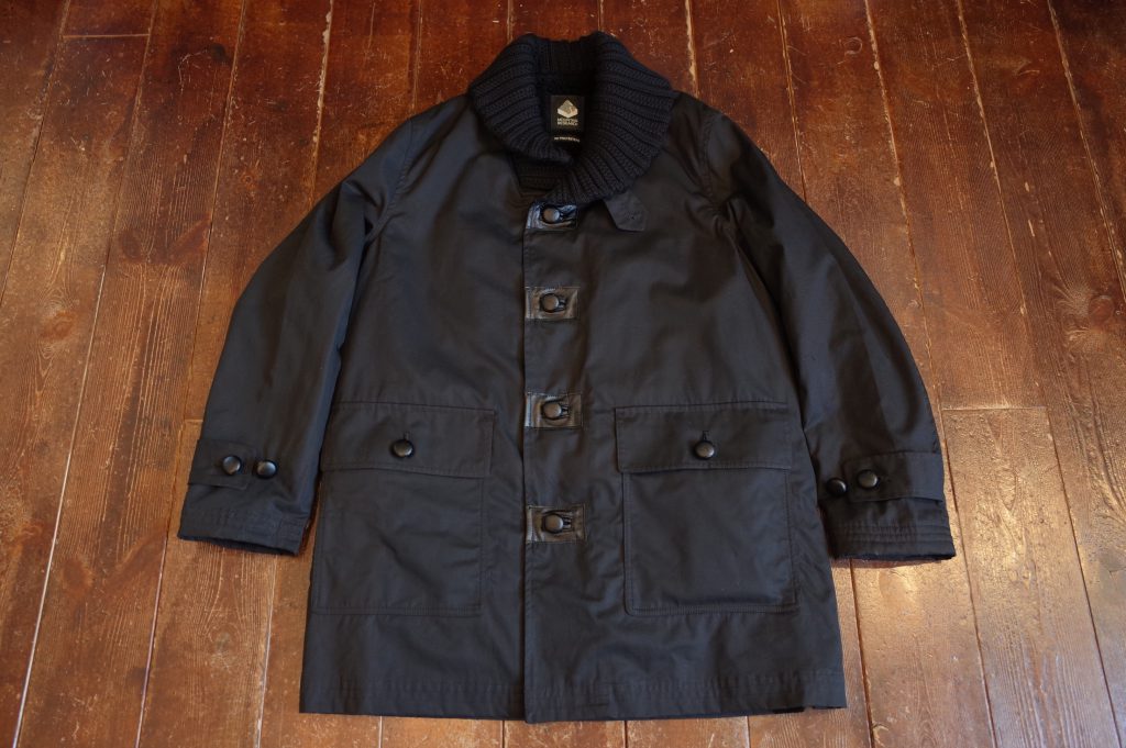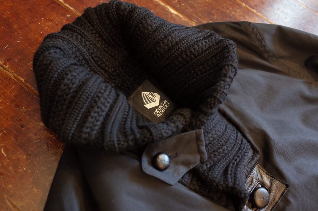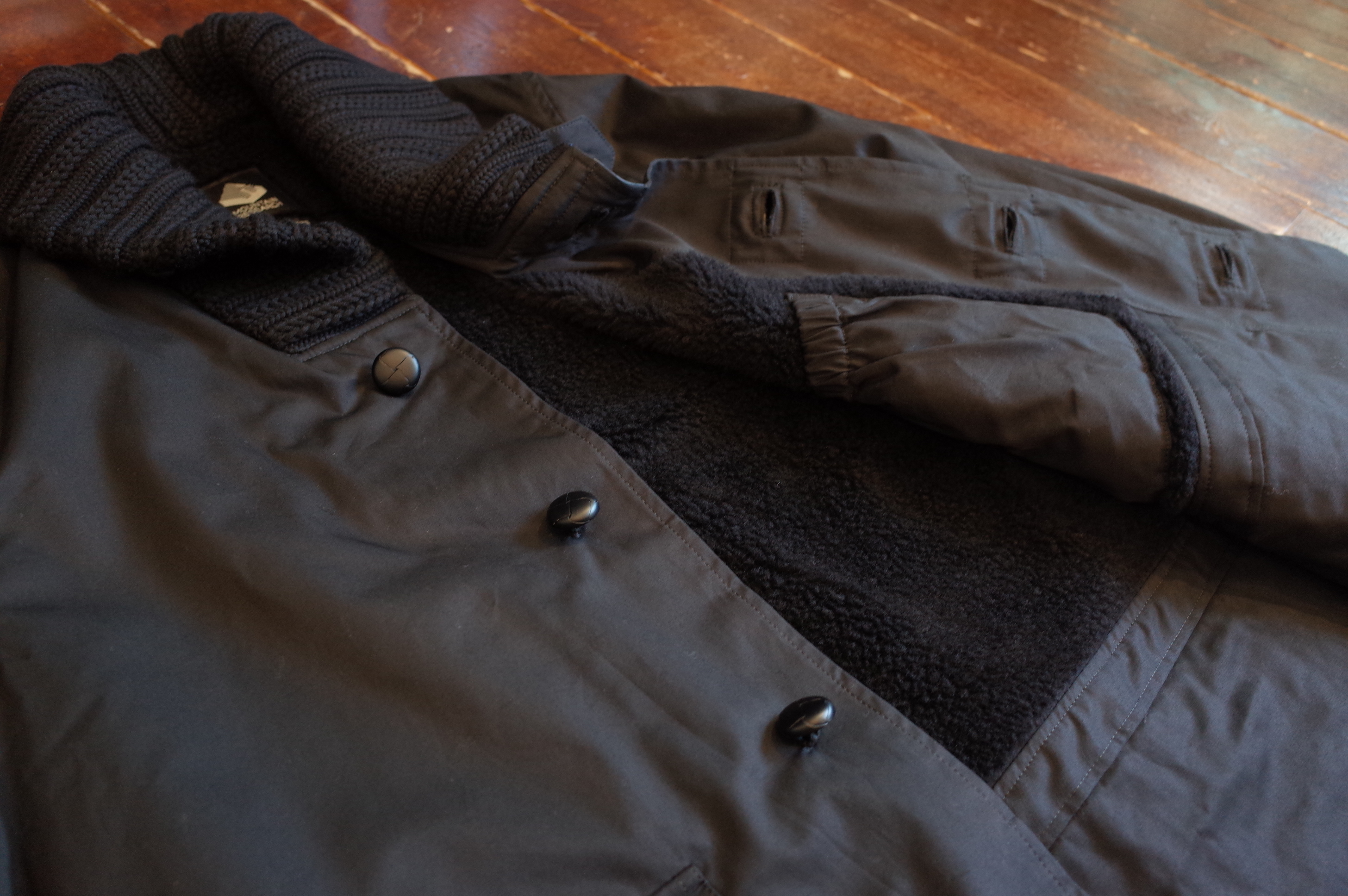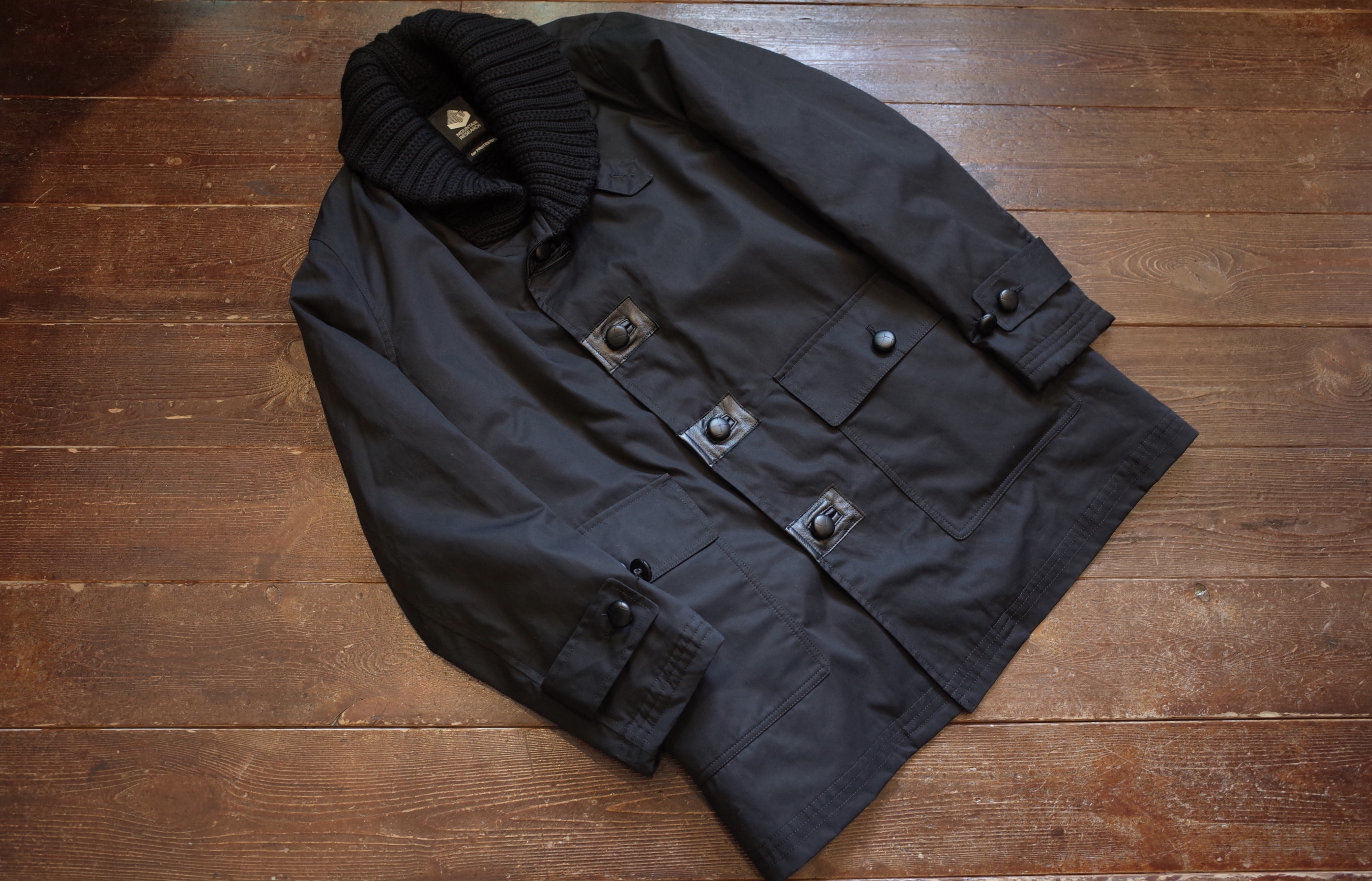 PROTESTER’s black cotton gaberdine donkey jacket with leather walnut buttons, boa lining, knit collar