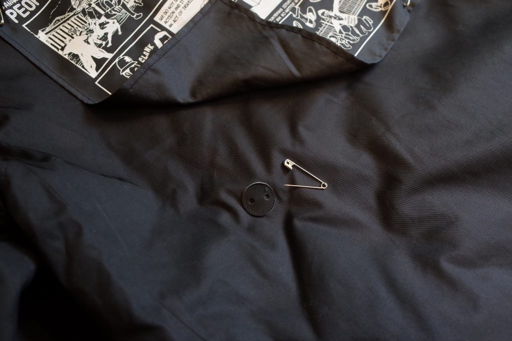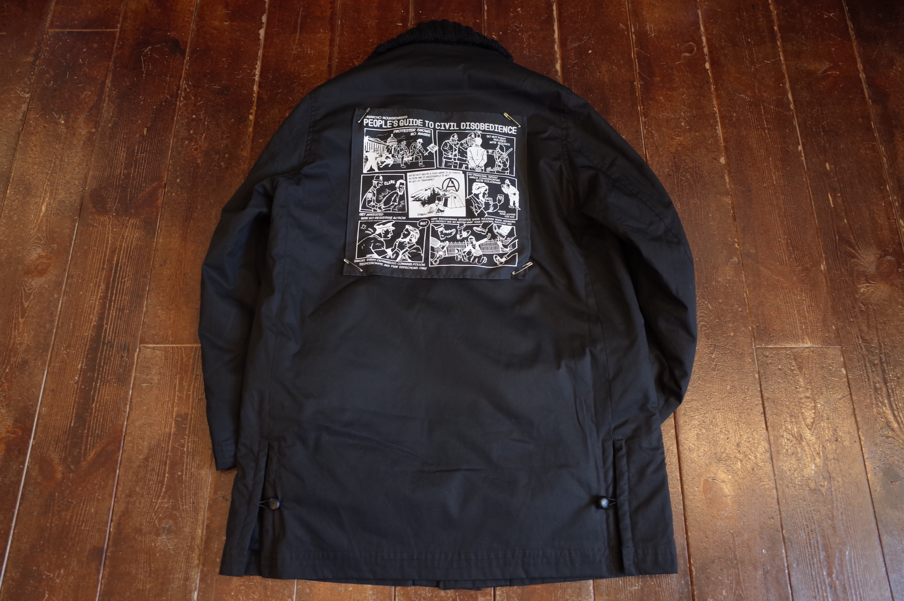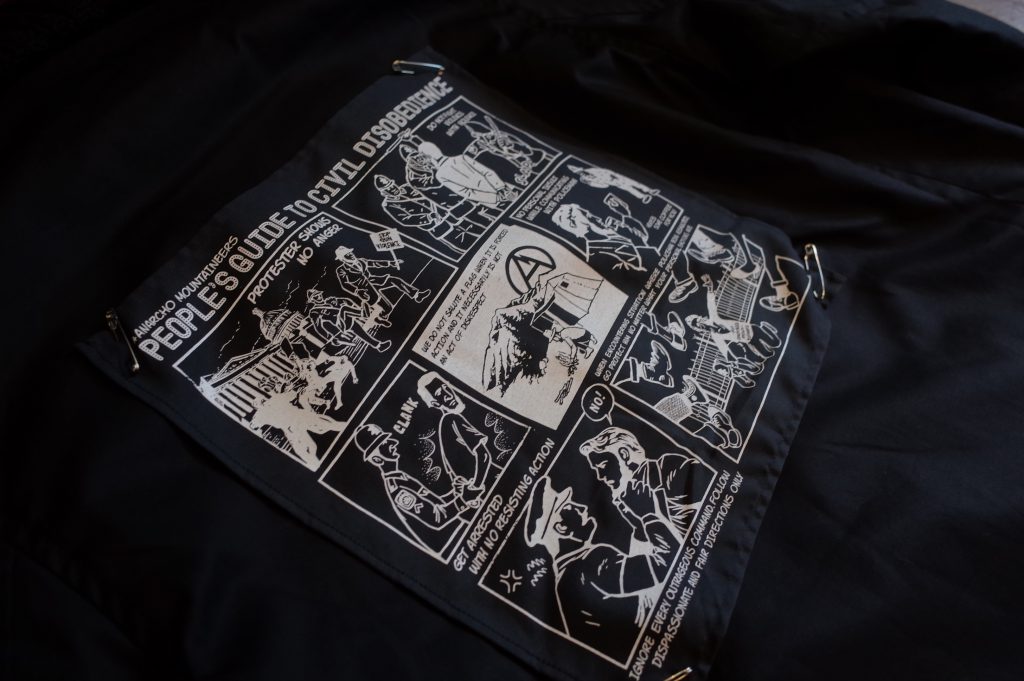 and removal back patch of Jerry Ukai’s Person’s Guide to Civil Disobedience cartoon graphic.