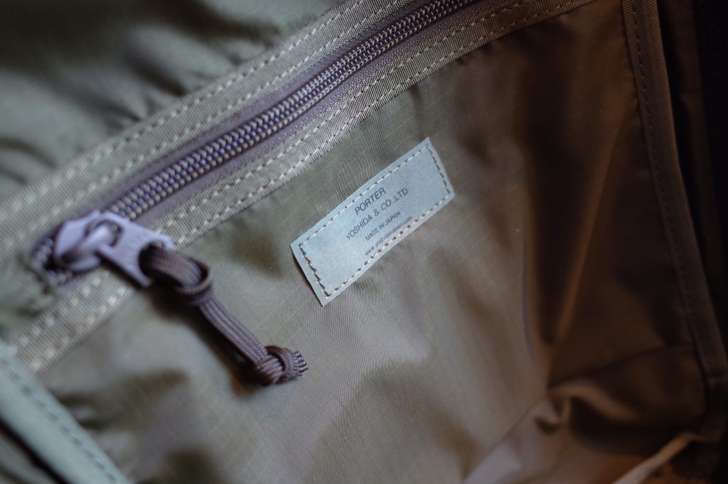 ミリタリー的なオリーブグリーンのナイロンリップストップ生地を使用、
