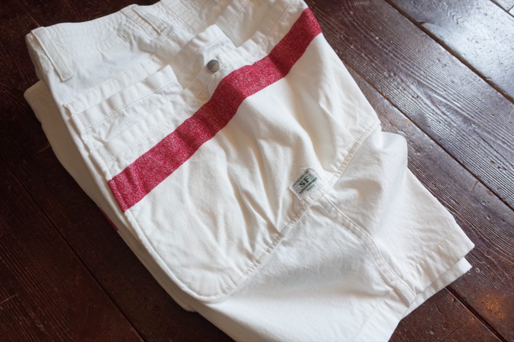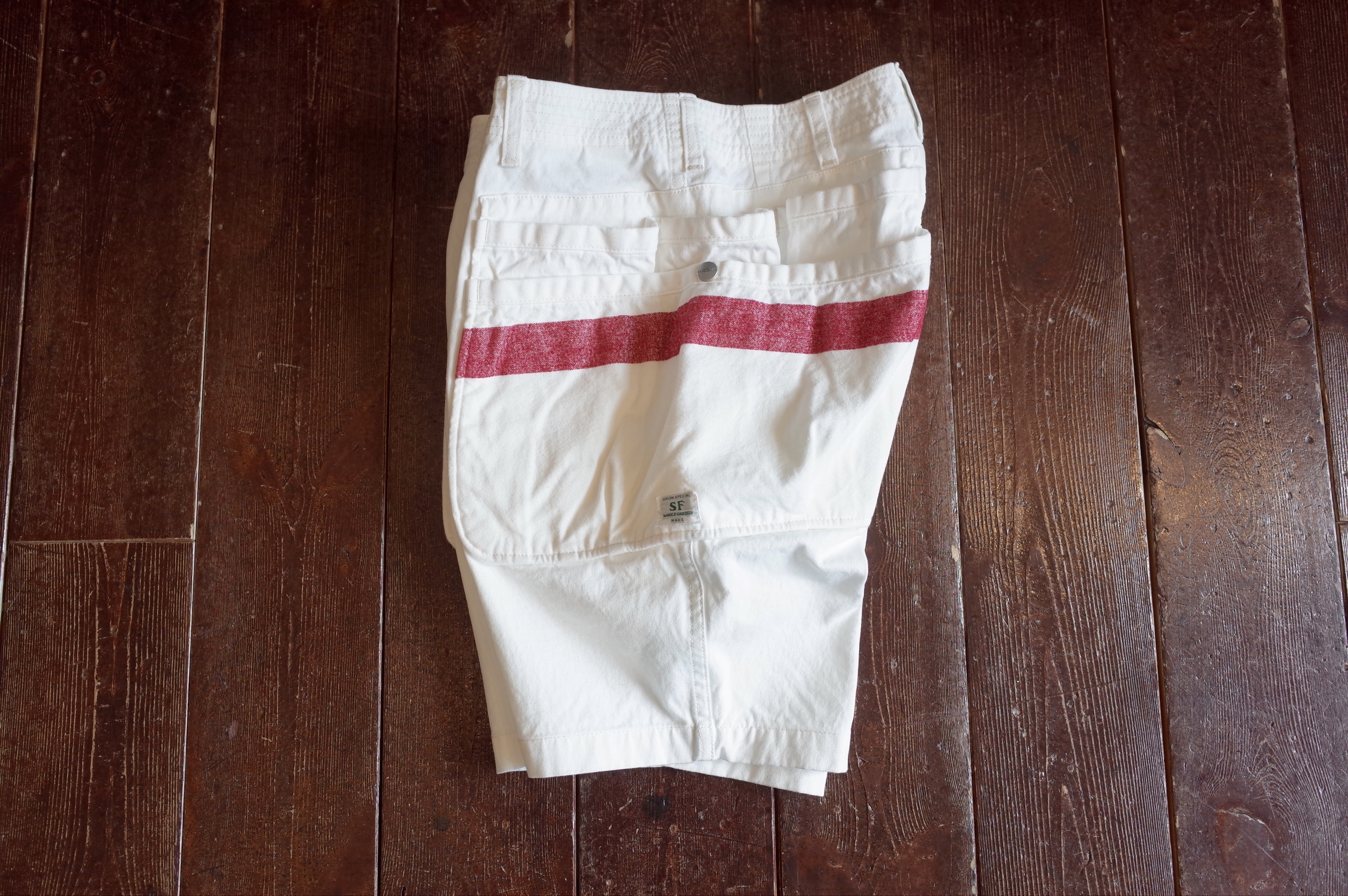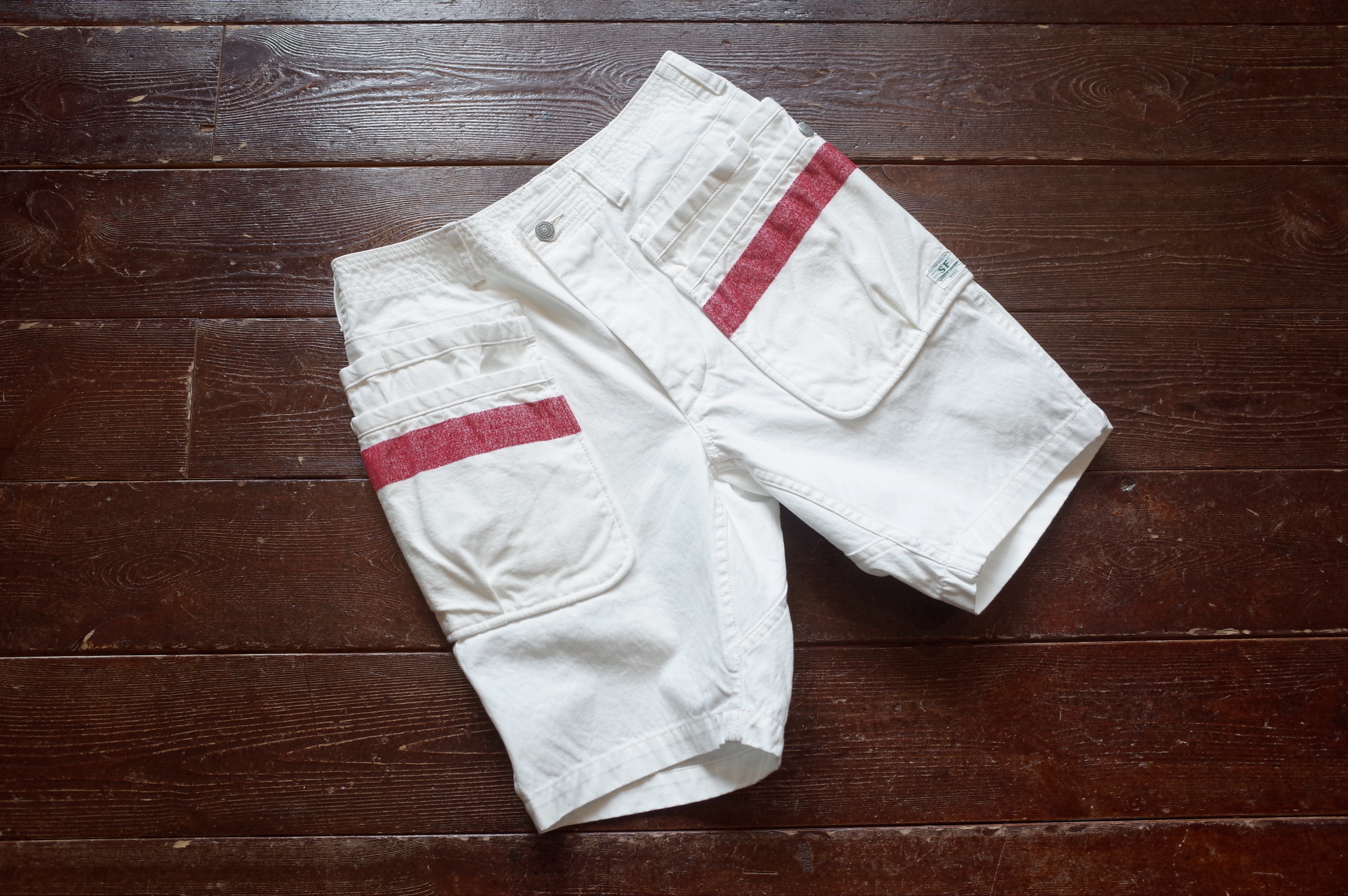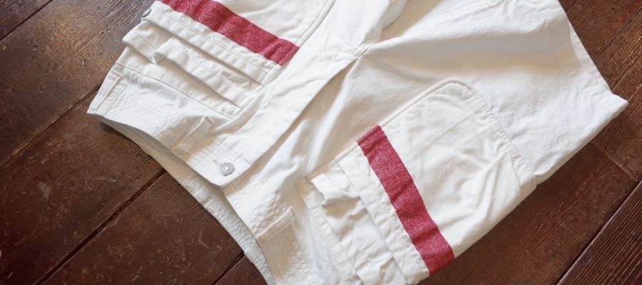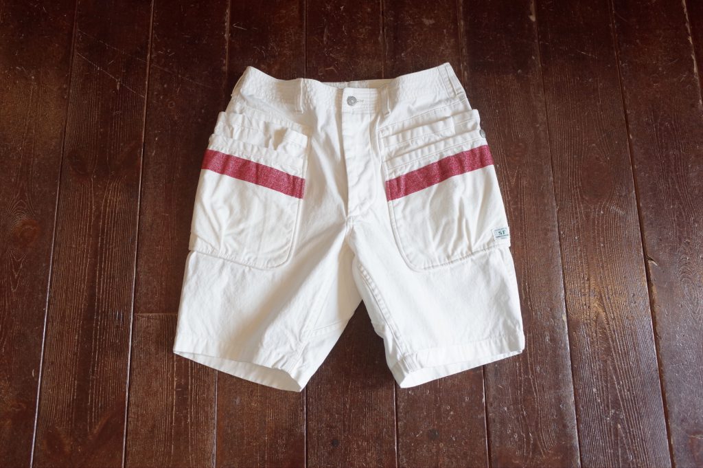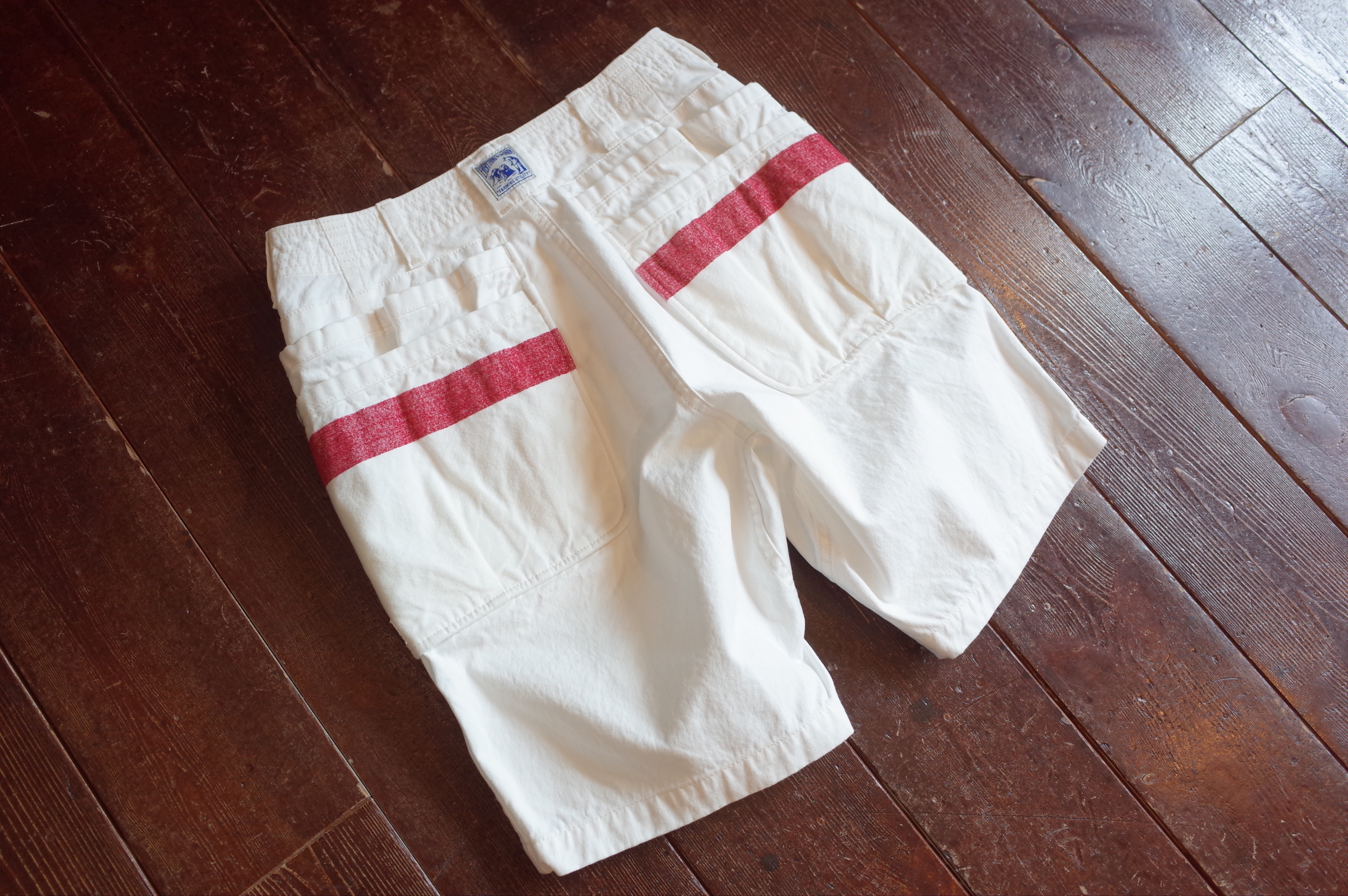 White canvas multi pocket shorts with mole yarm red stripe, a Sassafras collaboration piece based on their Whole Hole Pants 1/2.