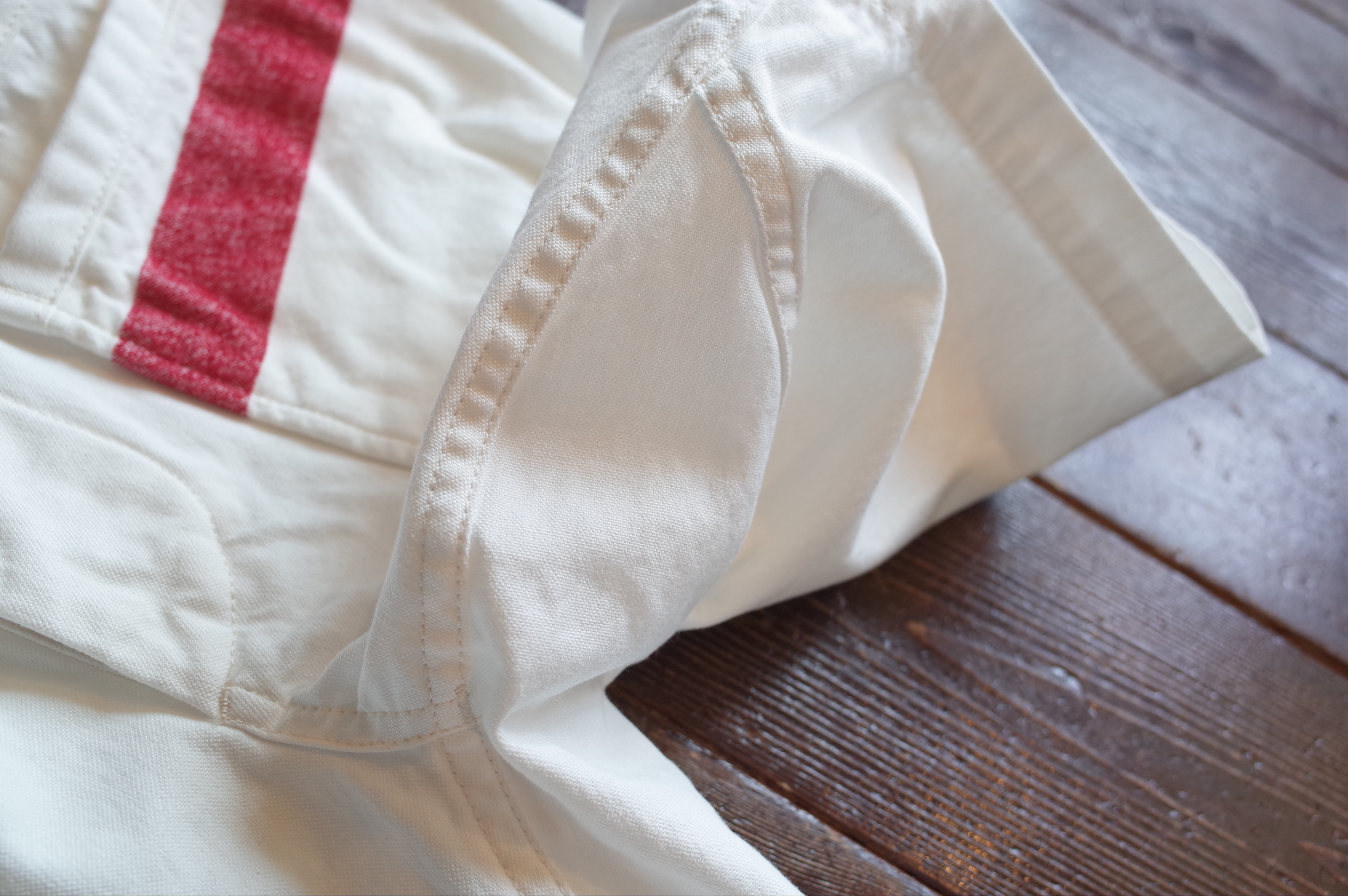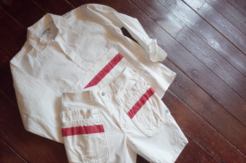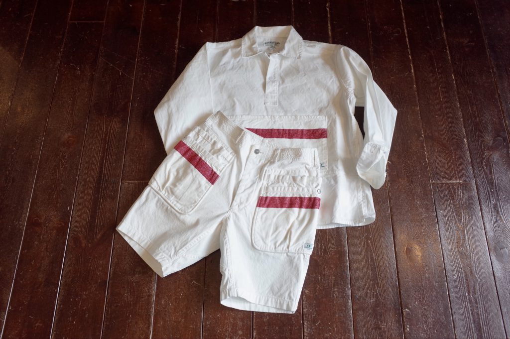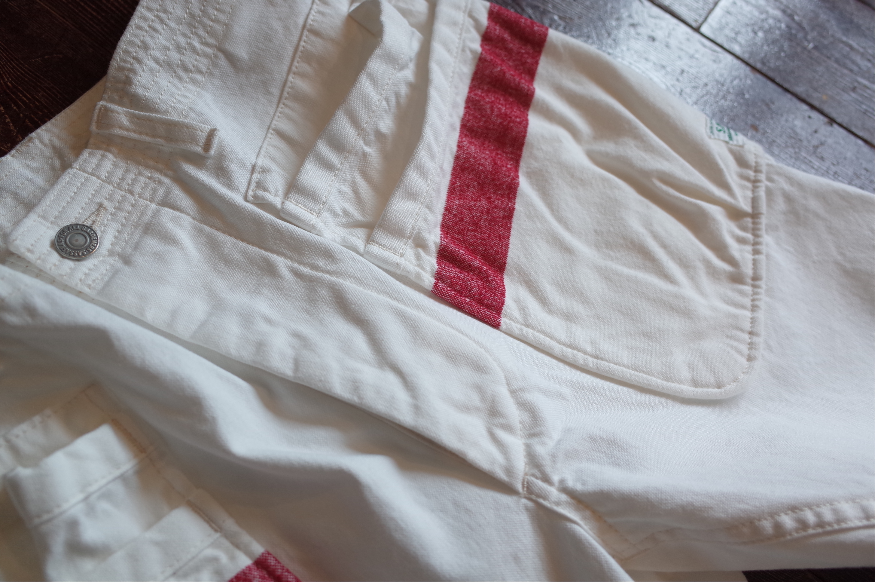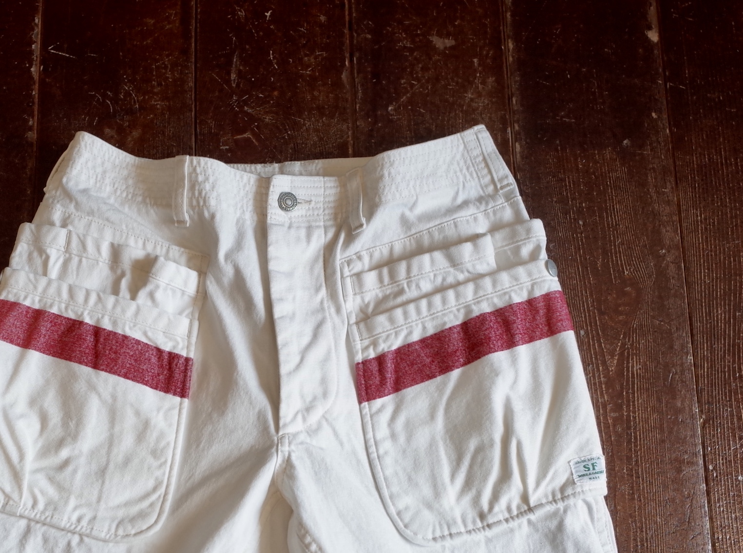 White canvas multi pocket shorts with mole yarm red stripe, a Sassafras collaboration piece based on their Whole Hole Pants 1/2.