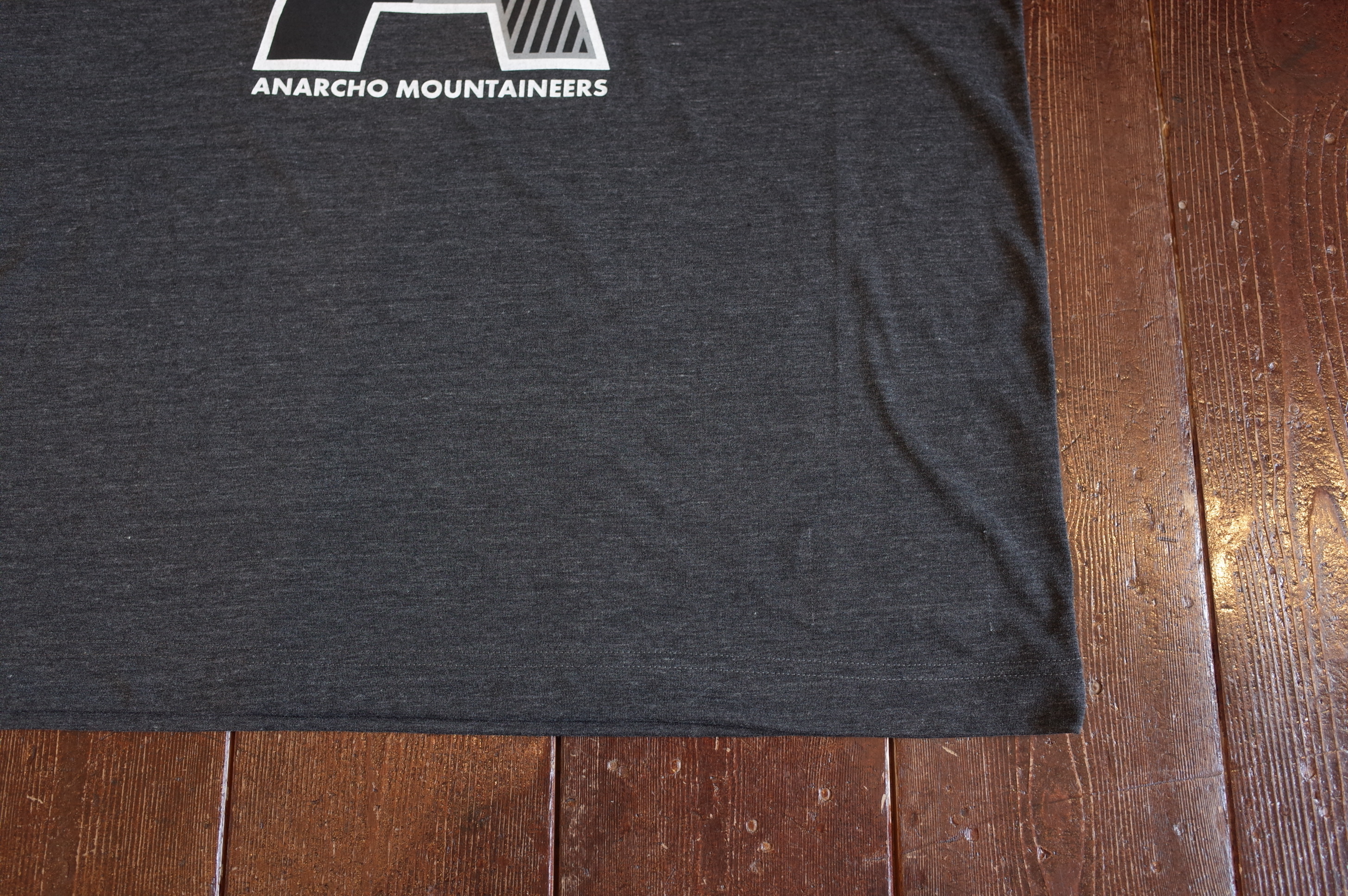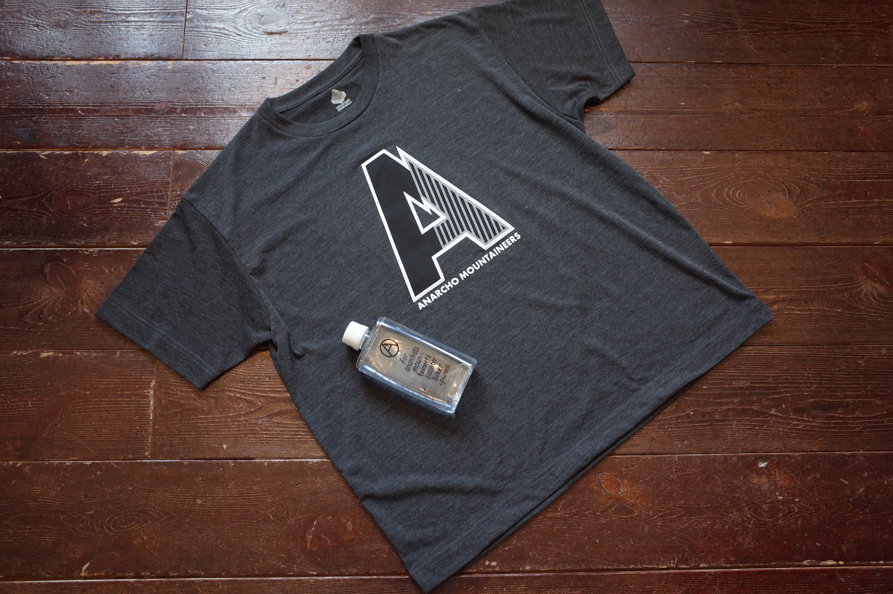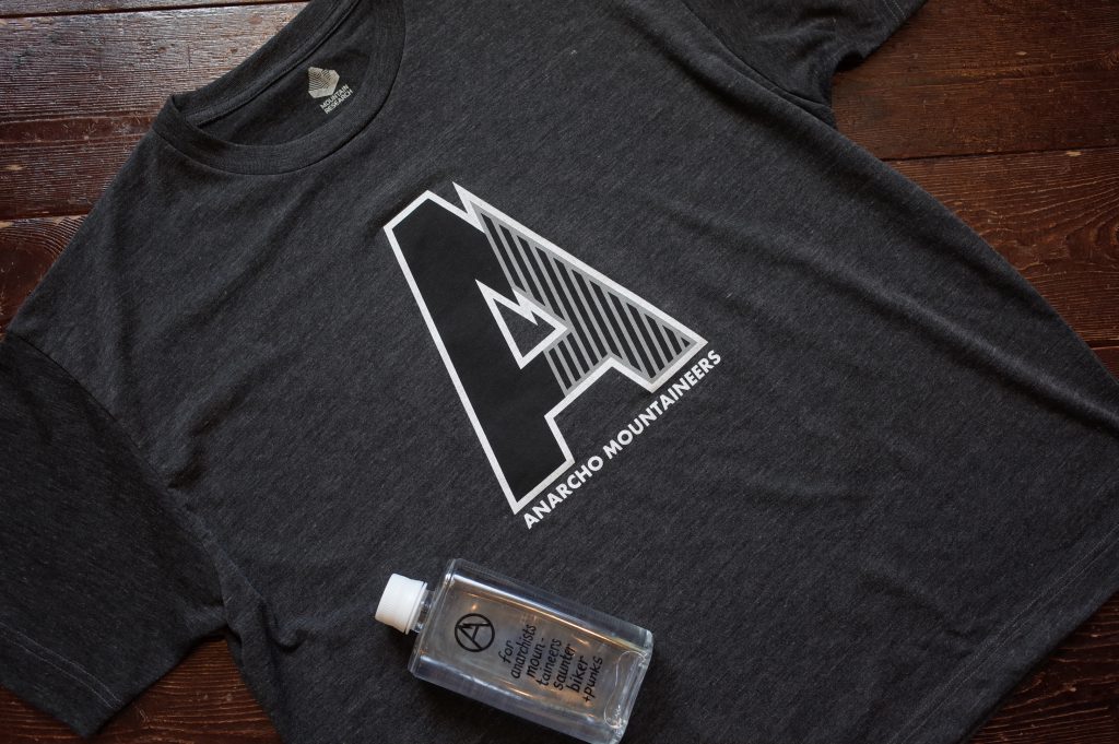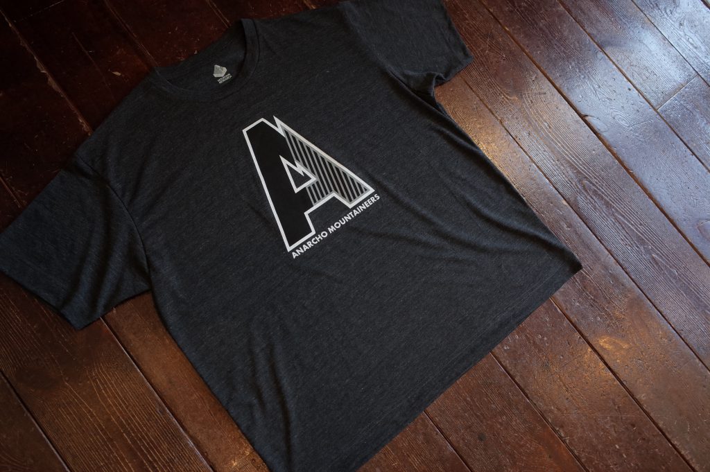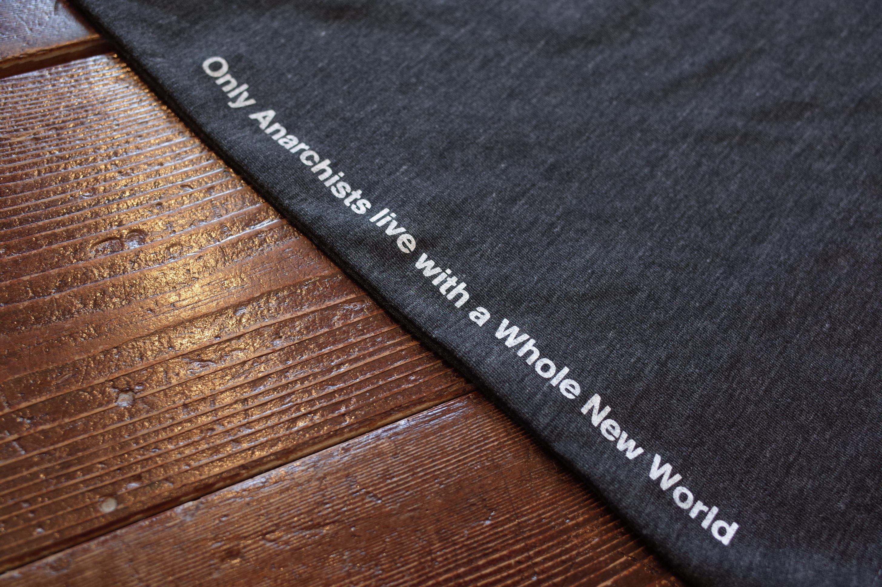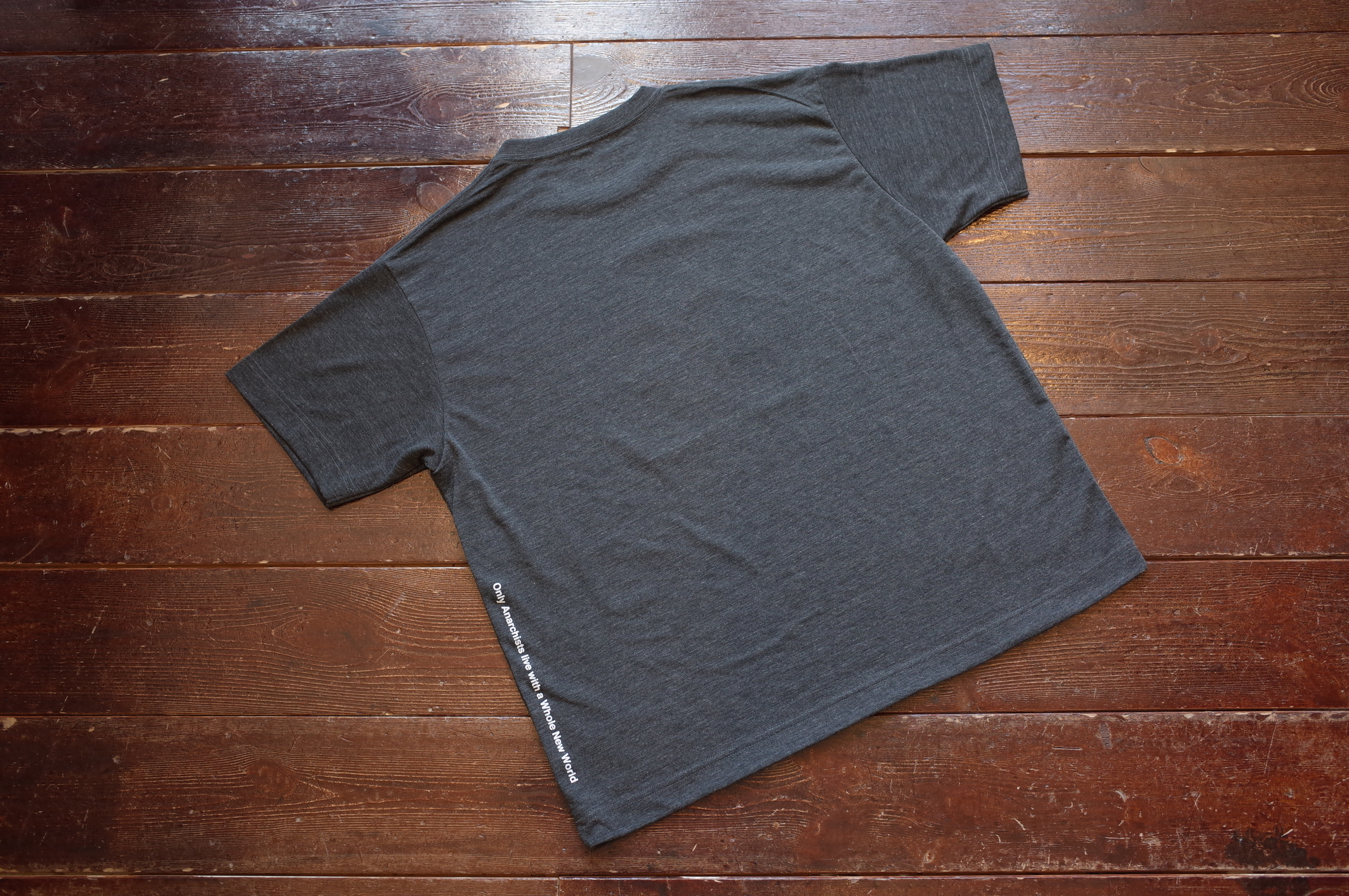 Quick dry jersey wide silhouette Tee with 2 tone A and Only Anarchist vertical slogan at left.