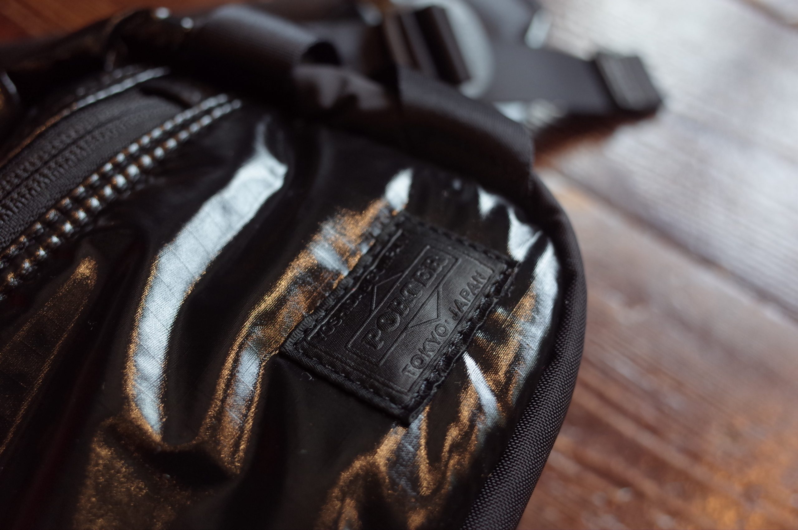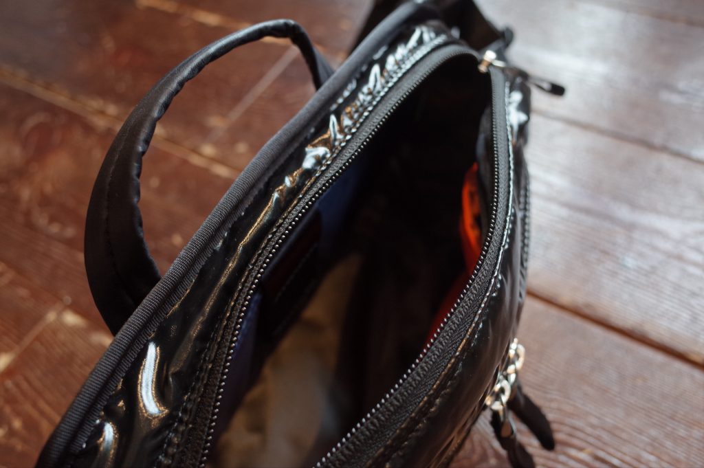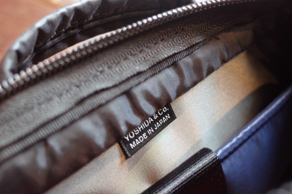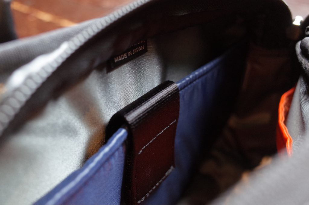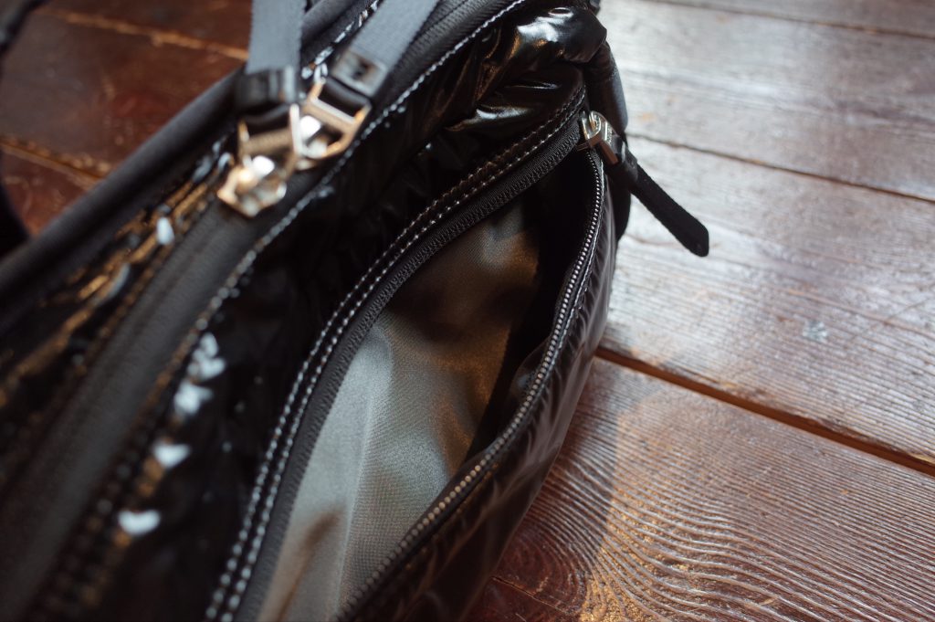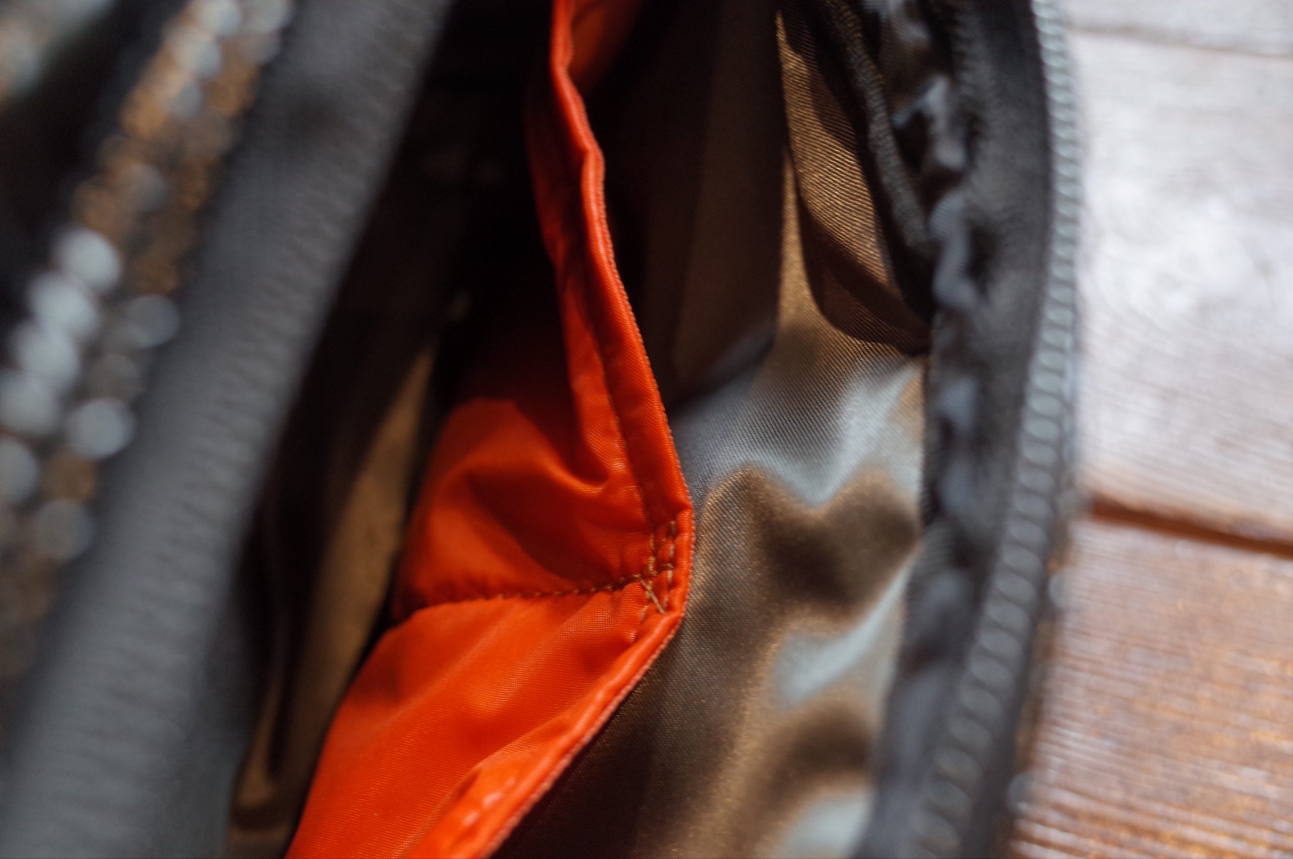 ファスナー付きポケットの裏地にはグレーカラーの生地を使用、