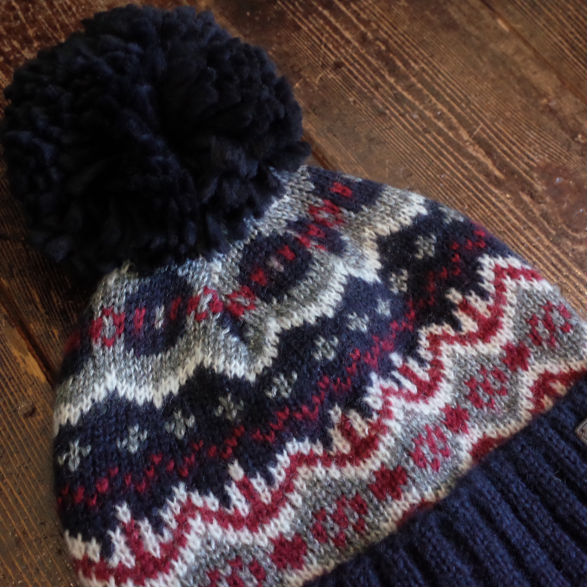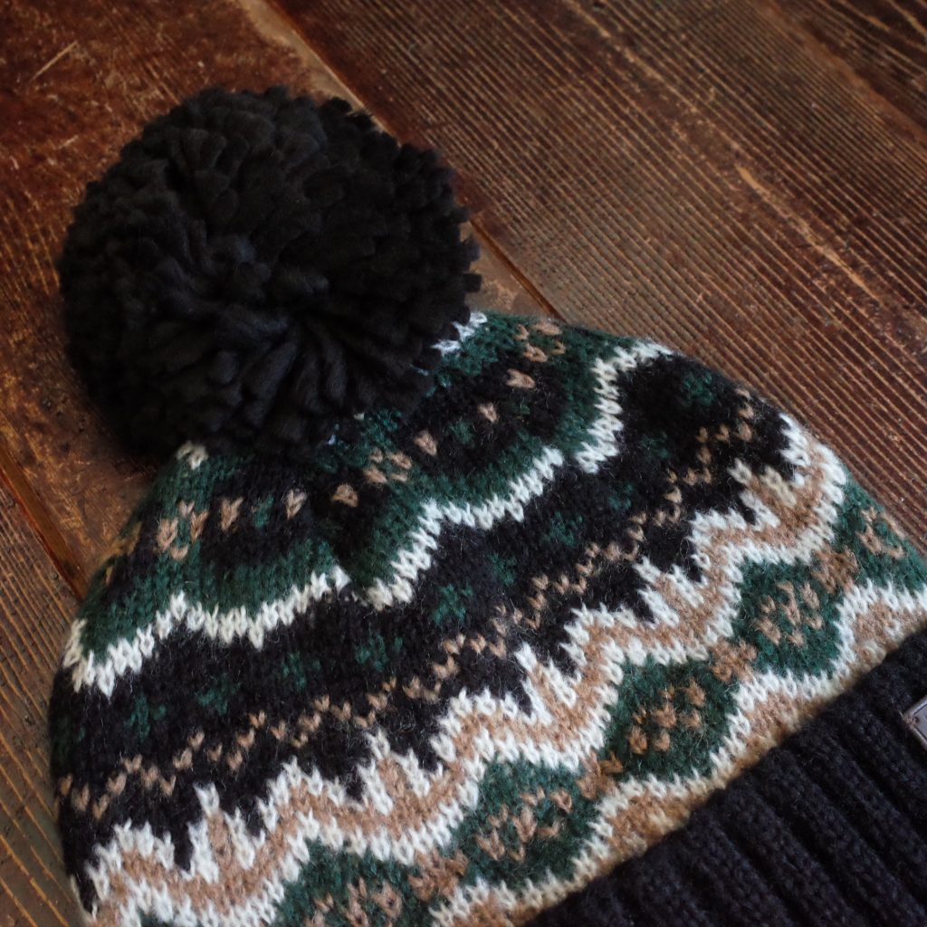 コントラストの効いたリブ編みの折り返し裾で編まれ、
